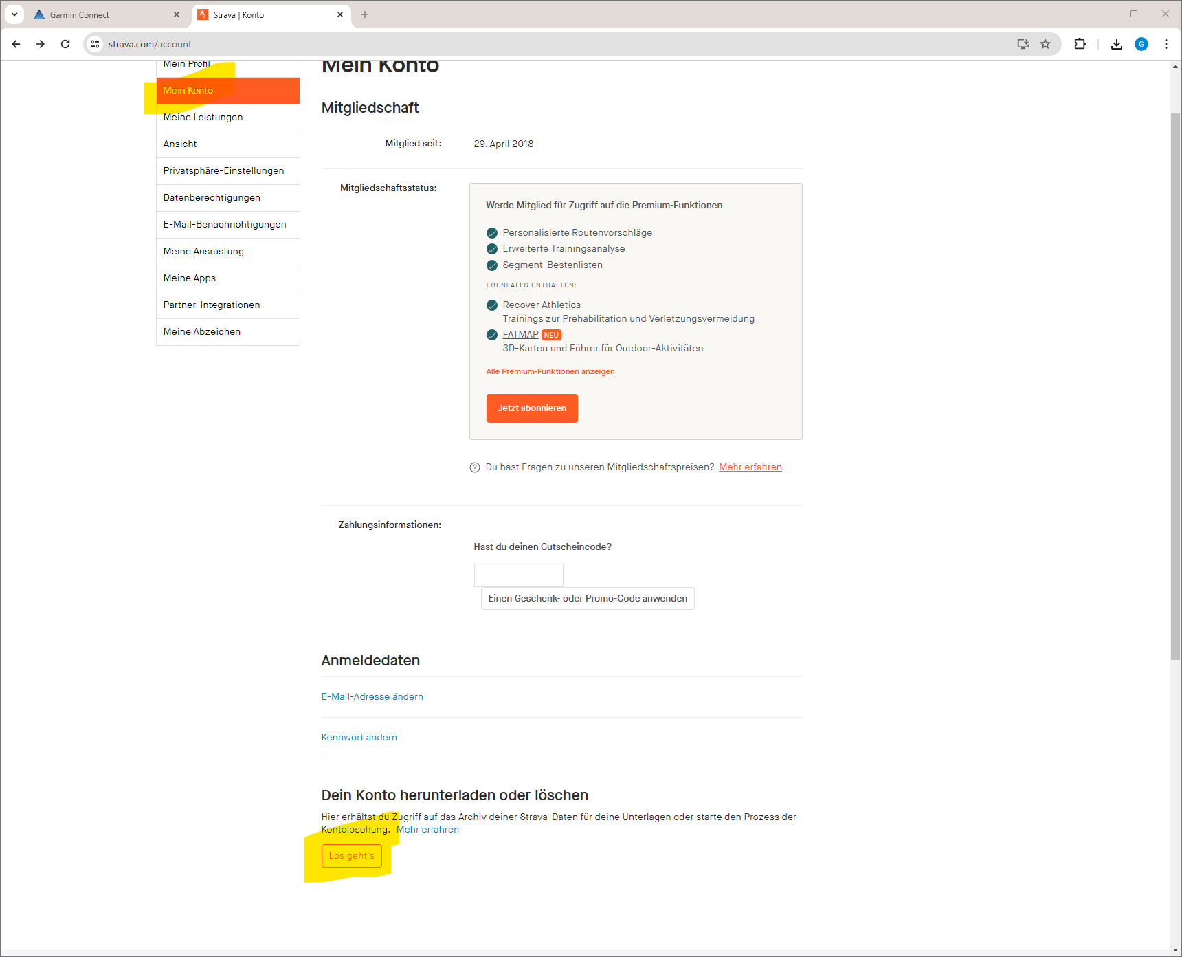 - Auf den Button Los geht´s unter Dein Konto herunterladen oder löschen klicken. Keine Sorge, der Klick startet nicht einen Löschprozess des Kontos.