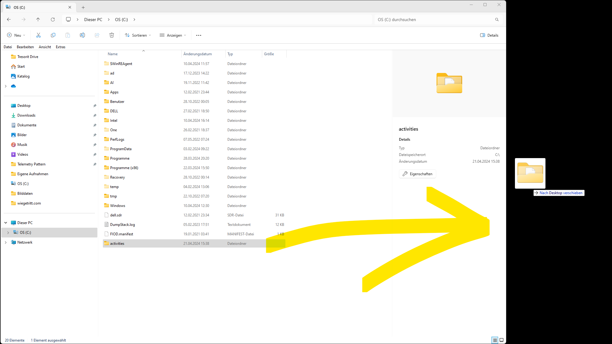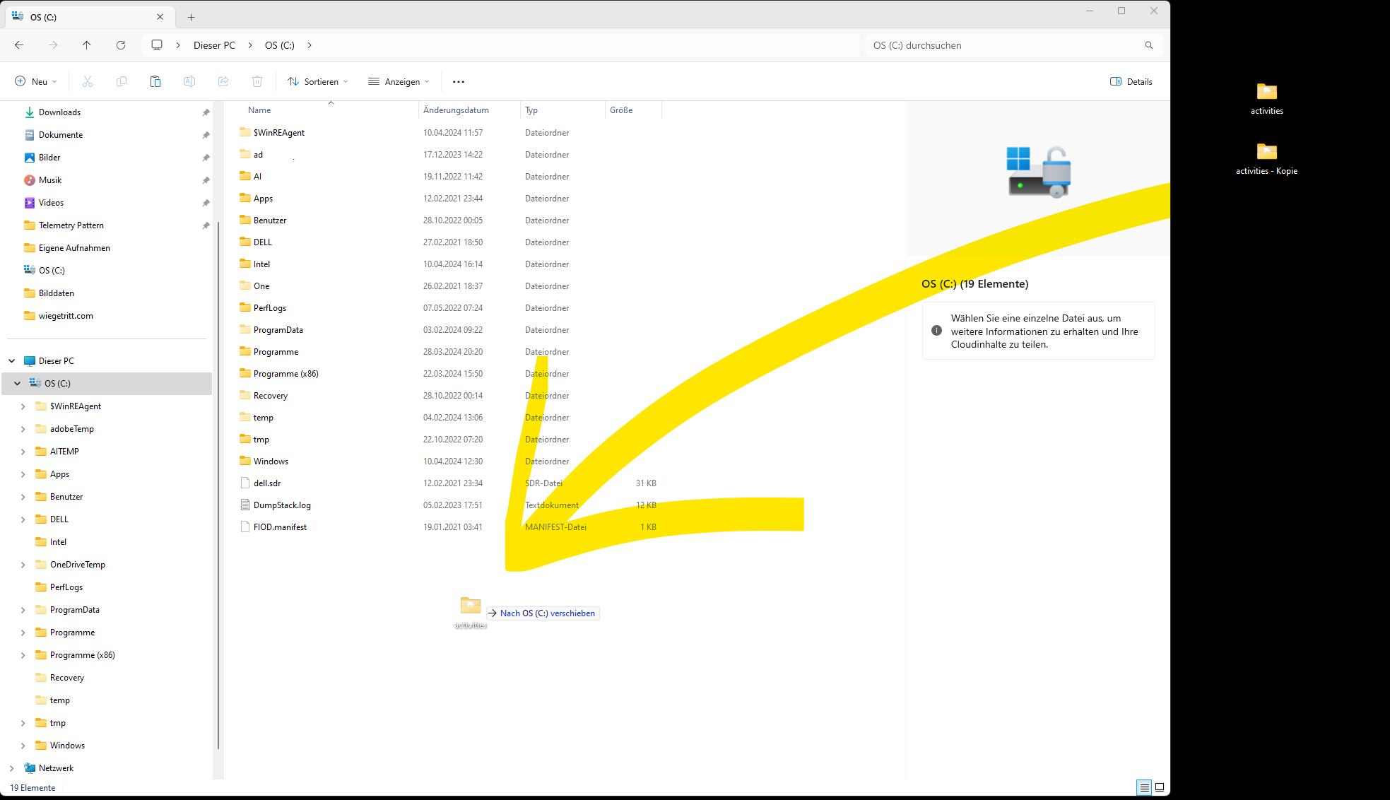 - Den Ordner activities auf die oberste Ebene des Laufwerk C: ziehen.