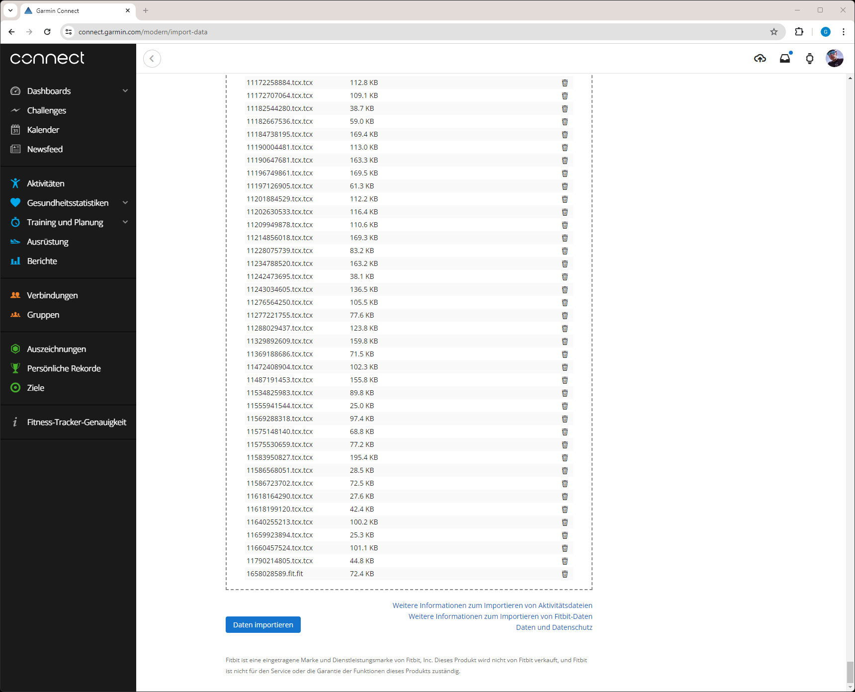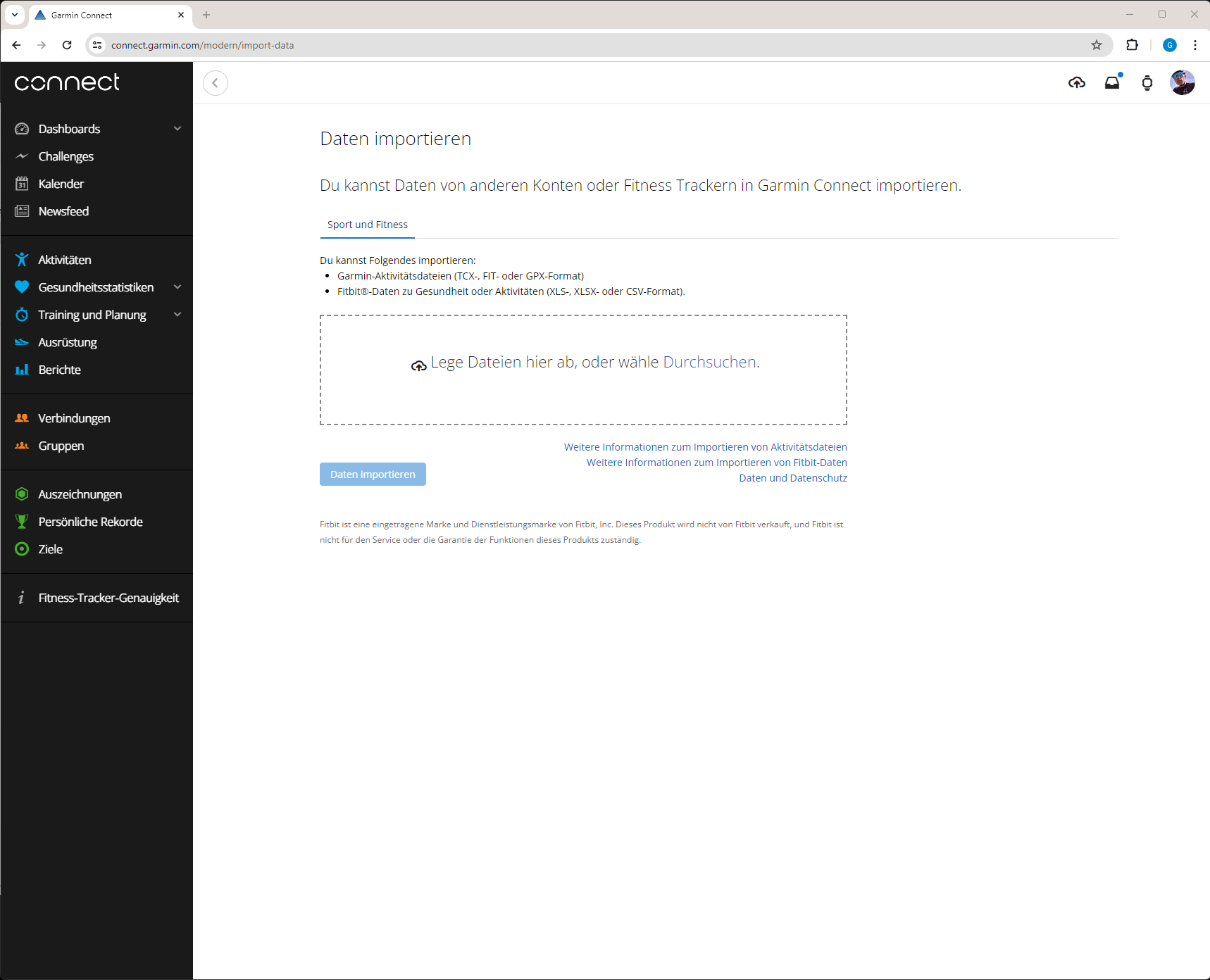 - Nun Garmin Connect im Browser öffnen, links Aktivitäten auswählen und oben auf Import klicken.