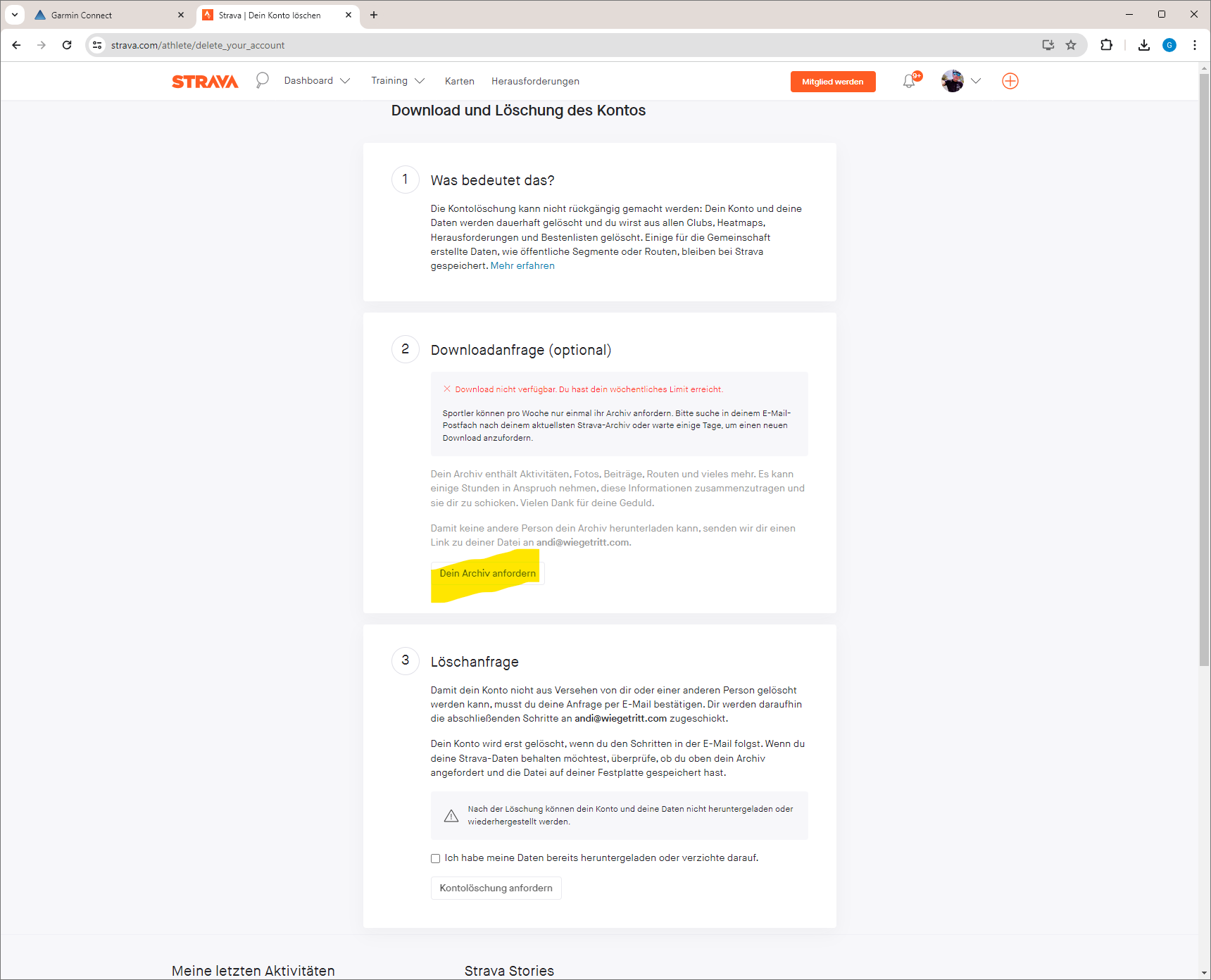 - Im zweiten weiß hinterlegten Block ist der Button Dein Archiv anfordern. Damit beginnt das Zusammenstellen der Daten. Strava sendet anschließend eine E-Mail mit einem Link zum Download. Achtung, das Archiv kann nur 1x pro Woche angefordert werden.