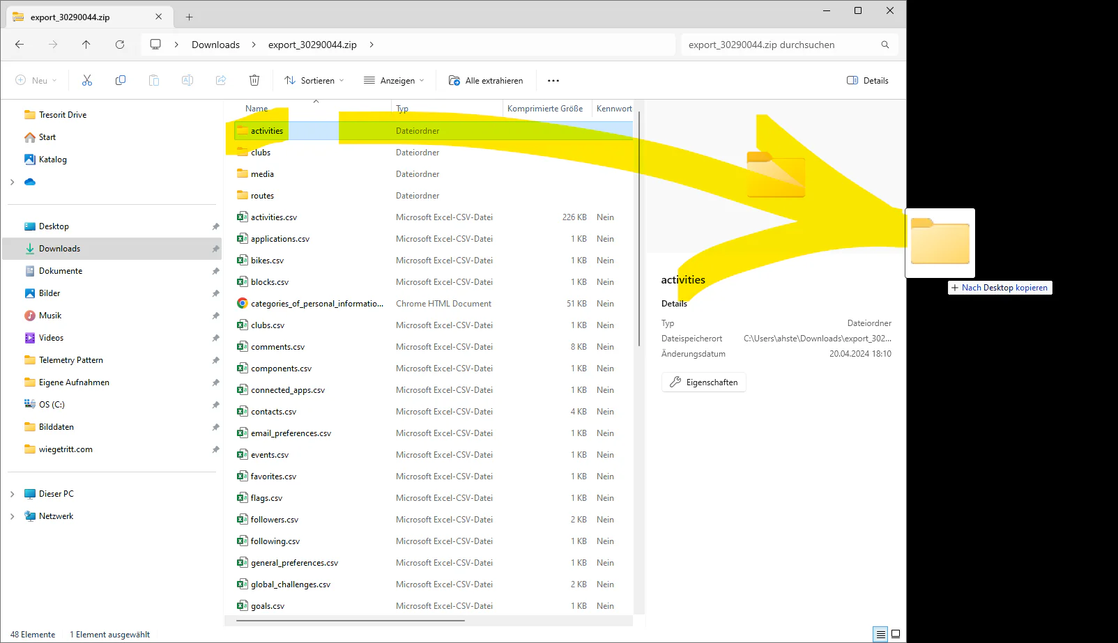 - Den Ordner activities auf das Desktop ziehen und so kopieren (oder einen anderen Speicherort). Warum kopieren und nicht verschieben? Der Download des Archivs ist nur 1x pro Woche möglich. Wenn in den folgenden Schritten etwas schief läuft, kann immer wieder auf die Originaldatei zurückgegriffen werden.