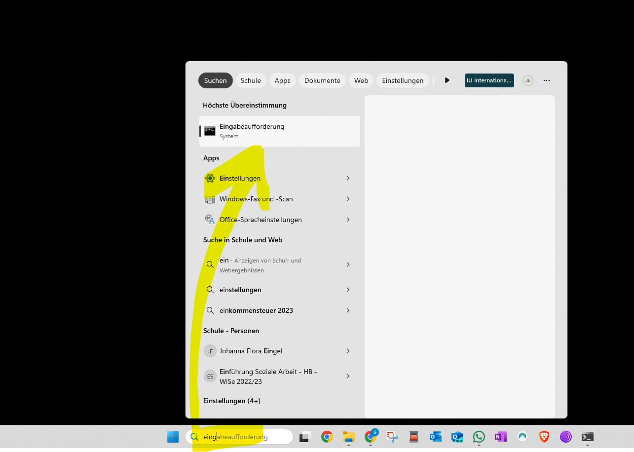 - In der Windows-Taskleiste im Feld Suche „Eingabeaufforderung“ eintragen und die vorgeschlagene App auswählen. Alternativ kann auch mit WIN+R das Ausführen-Fenster gestartet werden. Anschließend „cmd“ (für Command) eingeben und auf OK klicken.