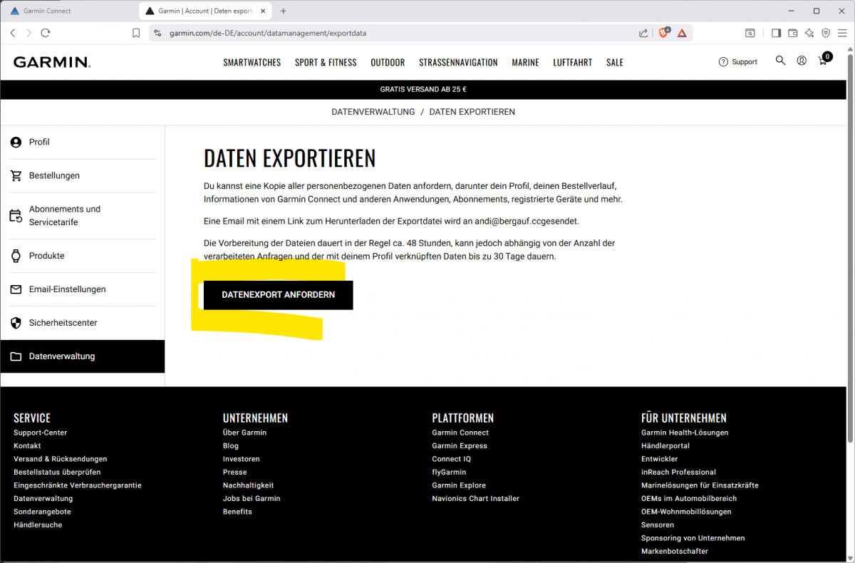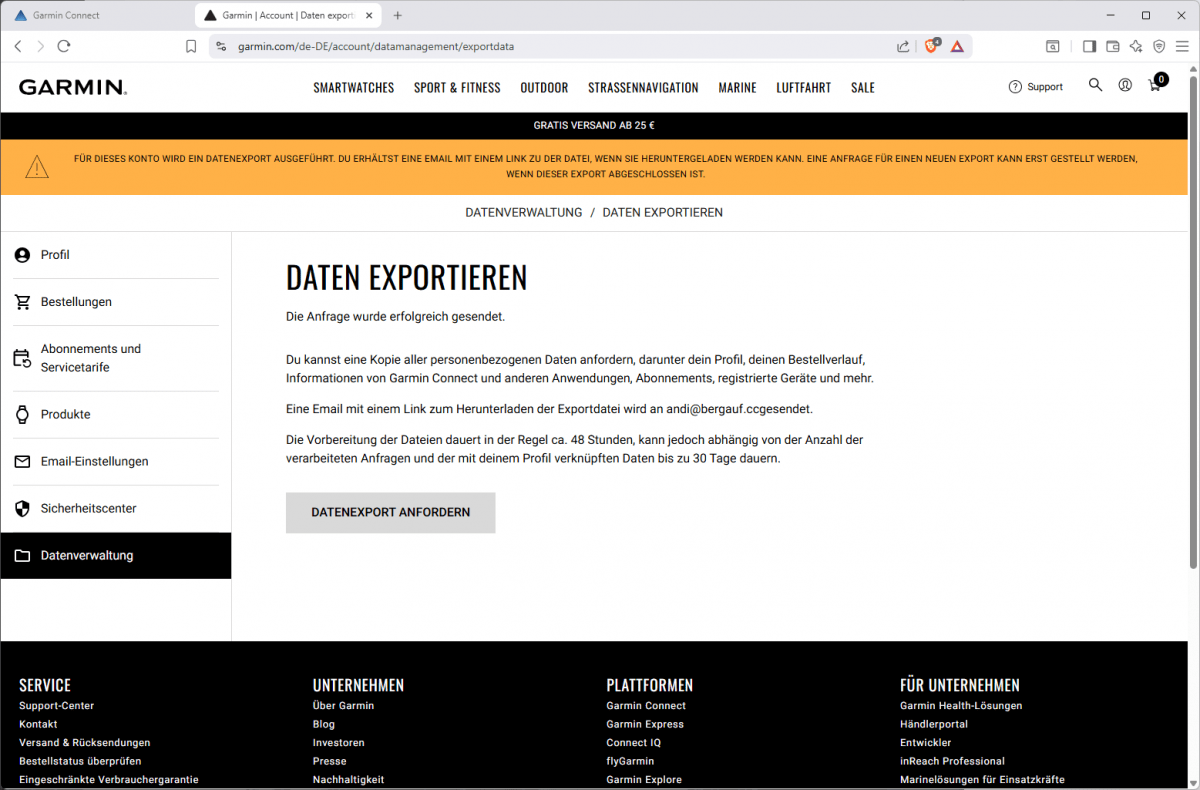 Auf Datenverwaltung und Daten exportieren klicken. Der Datenexport kann bis zu 48 Stunden dauern, geht aber meist schneller. Sobald die Downloaddatei bereit steht, erhältst du eine E-Mail.