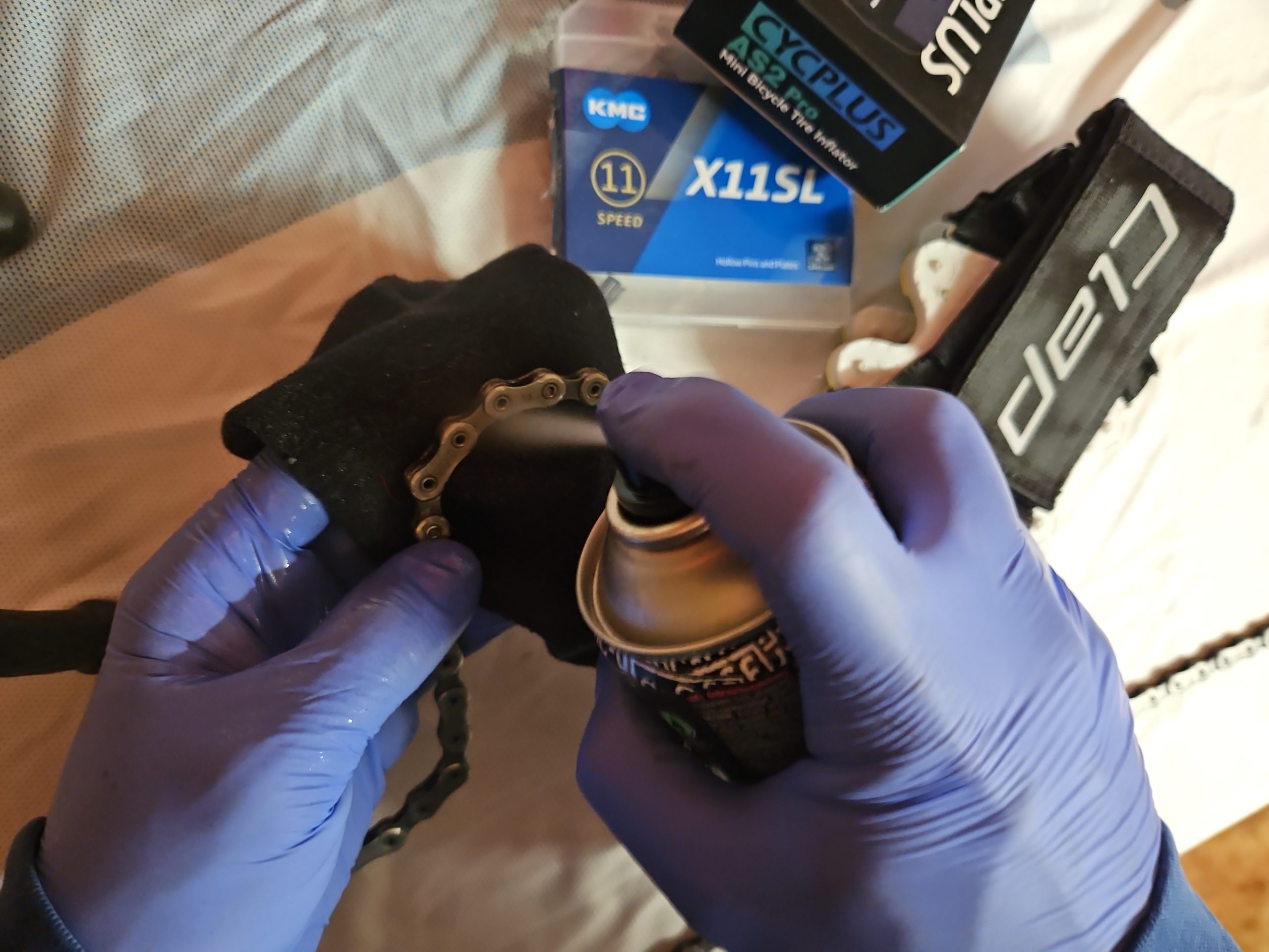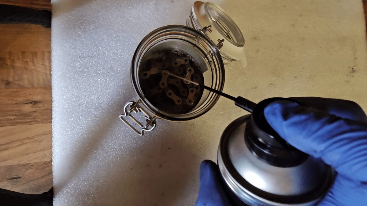 Der Reiniger muss sich vollständig verflüchtigen, bevor die Teile wieder montiert werden. Die Kette ist entfettet und frei von Schmierstoffen, wenn beim Bewegen ein typisches Rasseln zu hören ist.