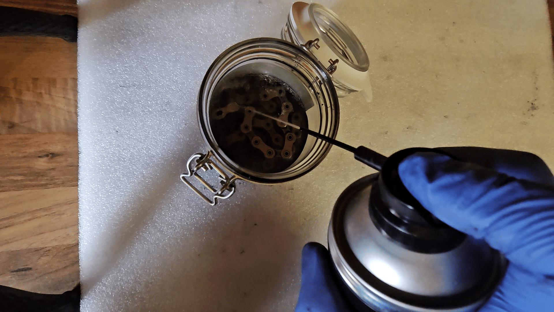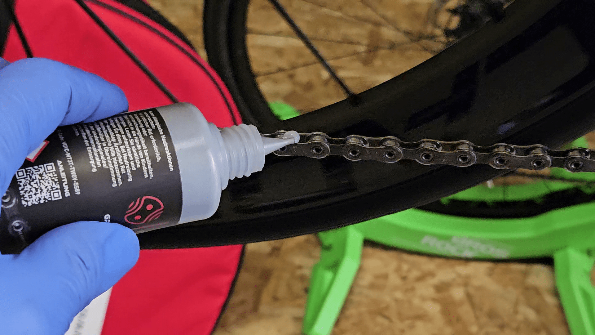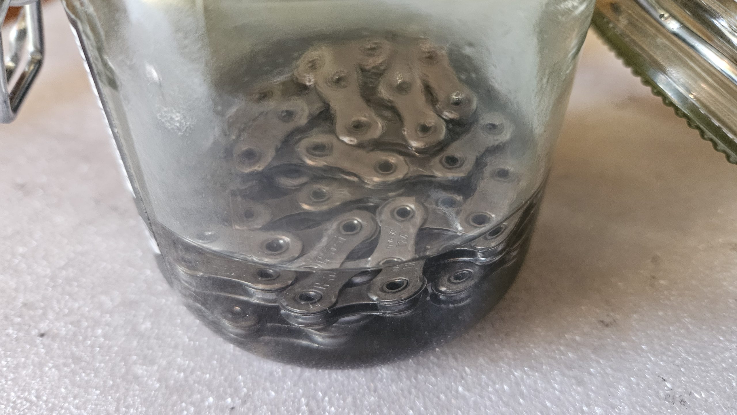 Anschließend die Kette mindestens eine Stunde trocknen lassen, besser über Nacht. Die Rückstände vom Reiniger verflüchtigen sich in dieser Zeit.