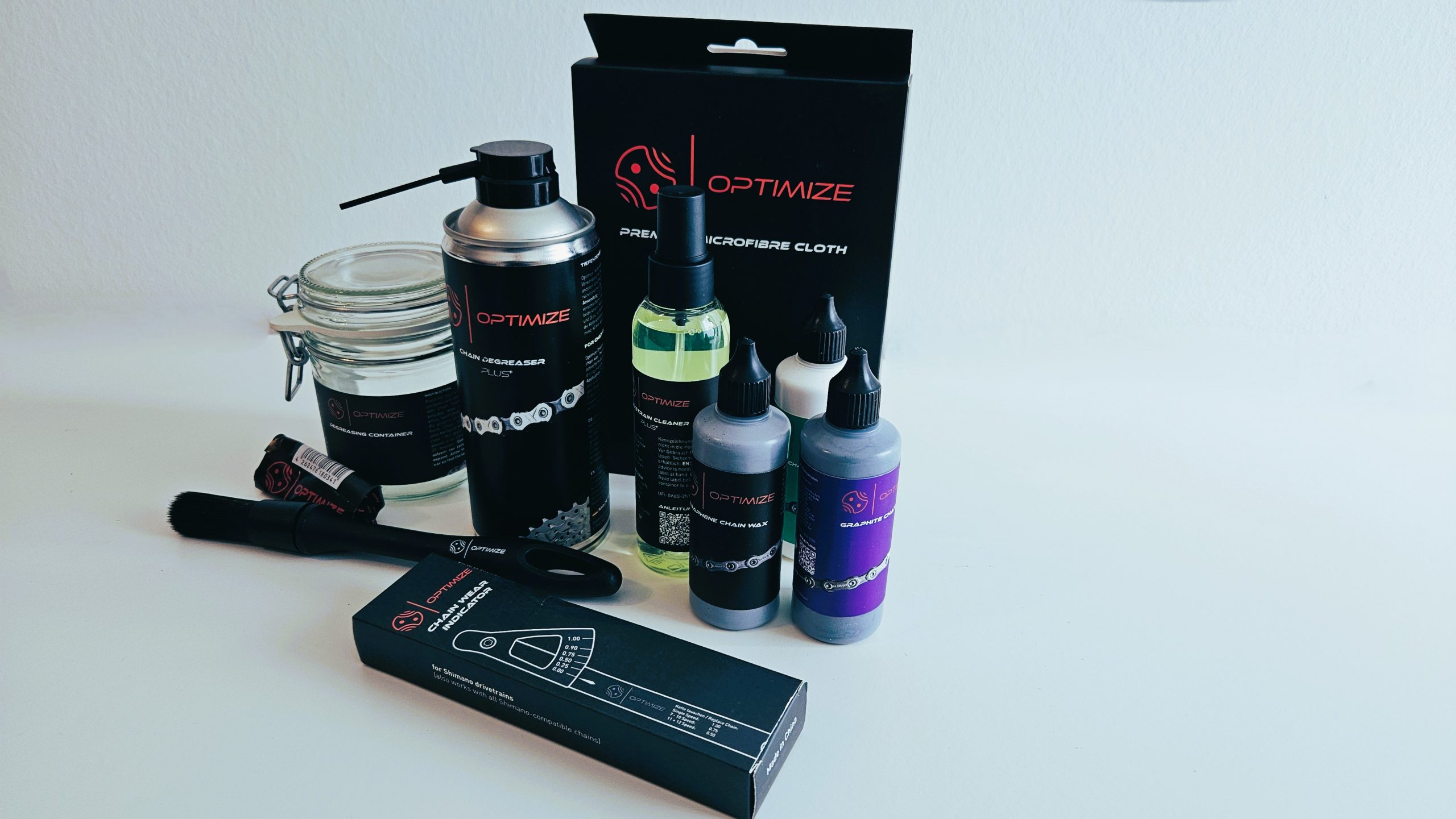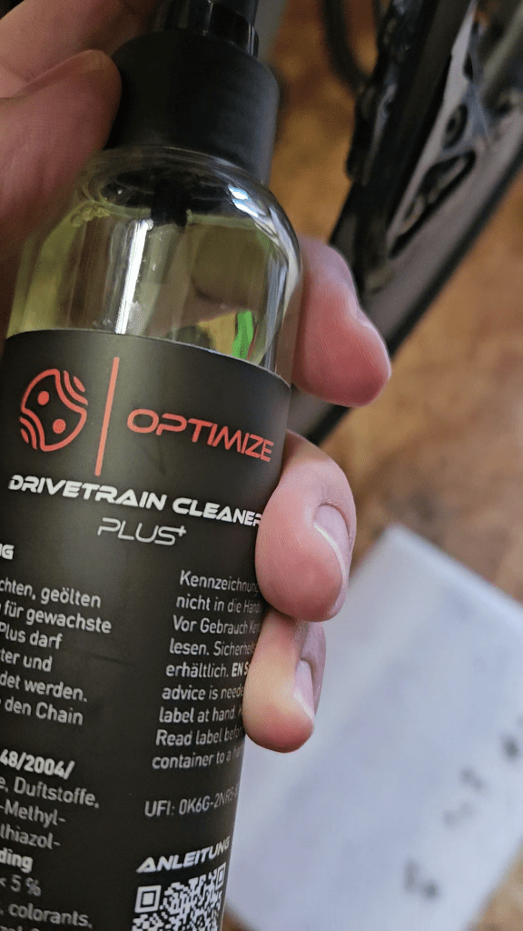Jetzt wird die Kette nochmal ordentlich grundgereinigt. Hierzu kann ein üblicher Kettenreiniger oder Bremsenreiniger verwendet werden. Wir verwenden anschließend den Optimize Degreasser Plus Reiniger.