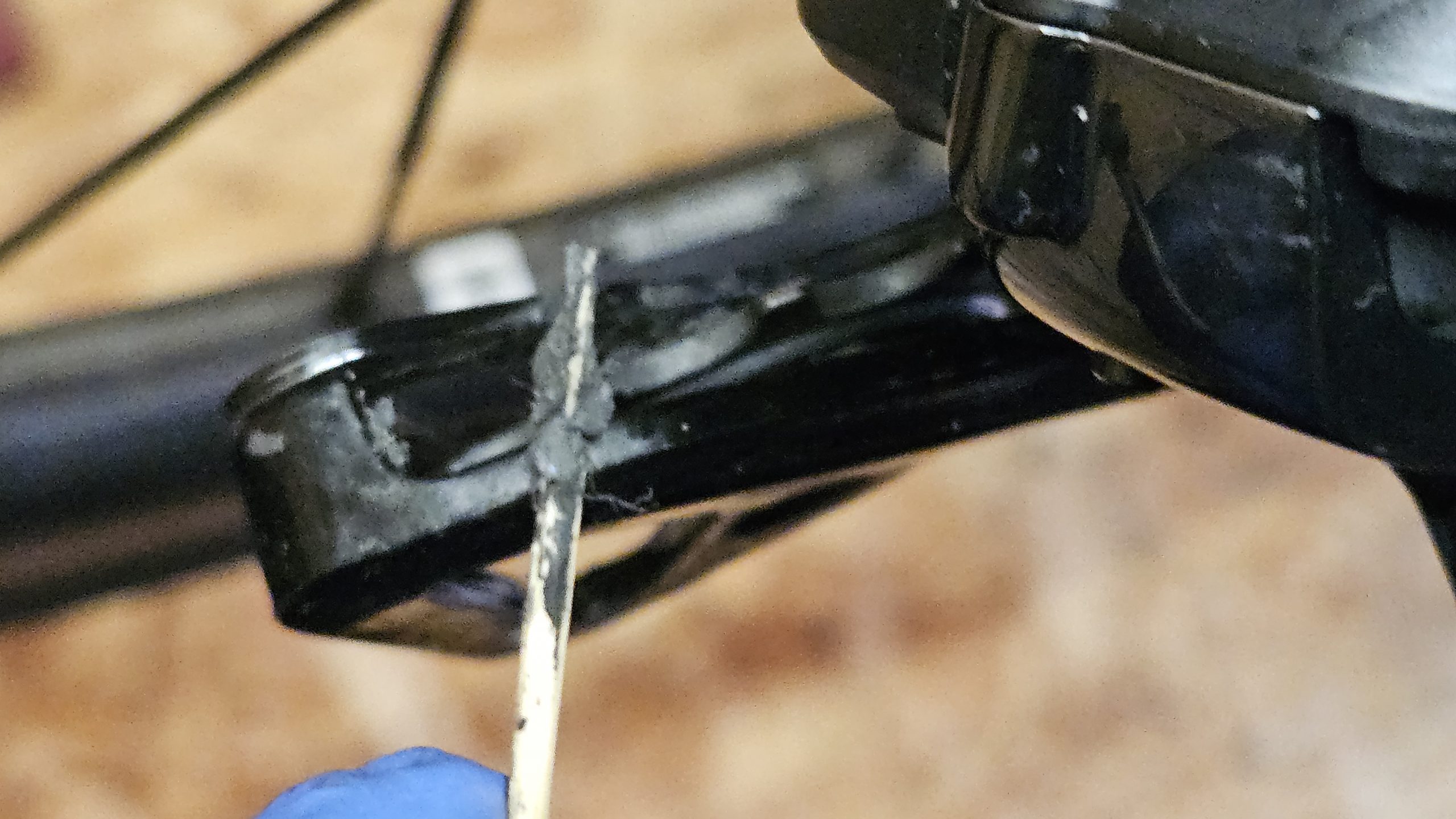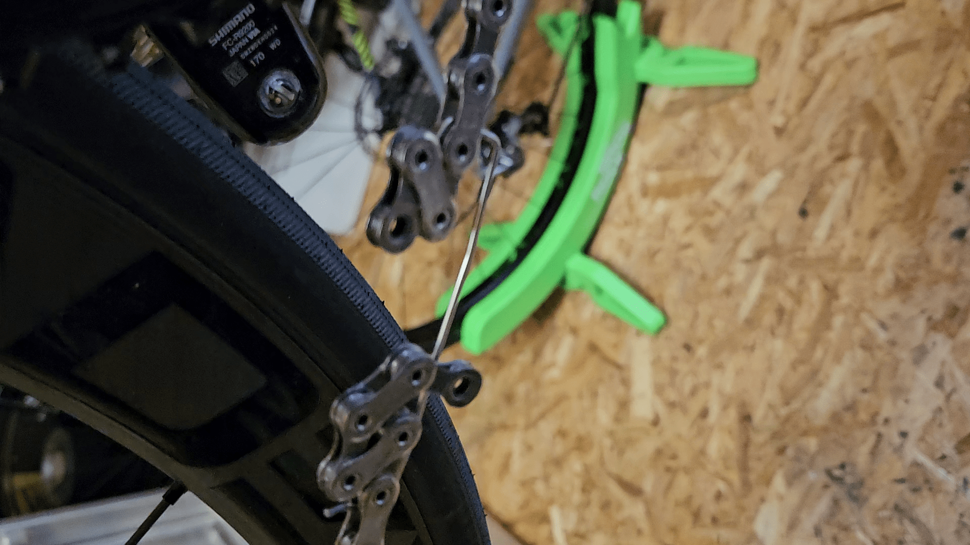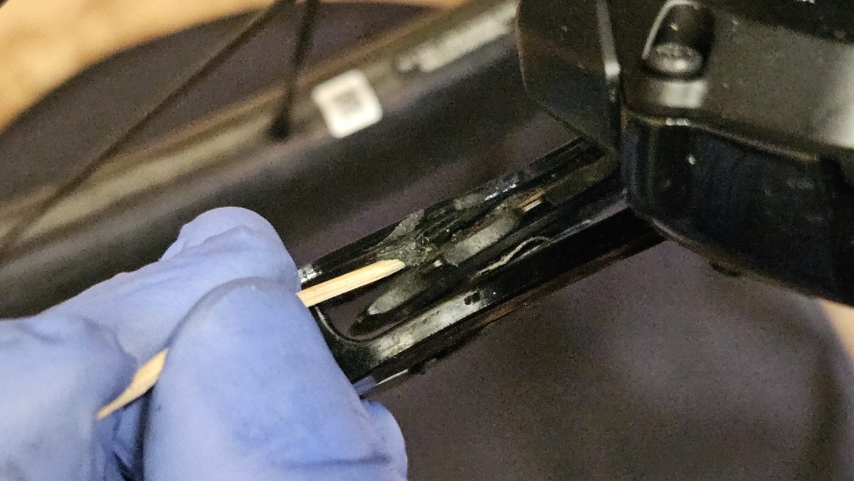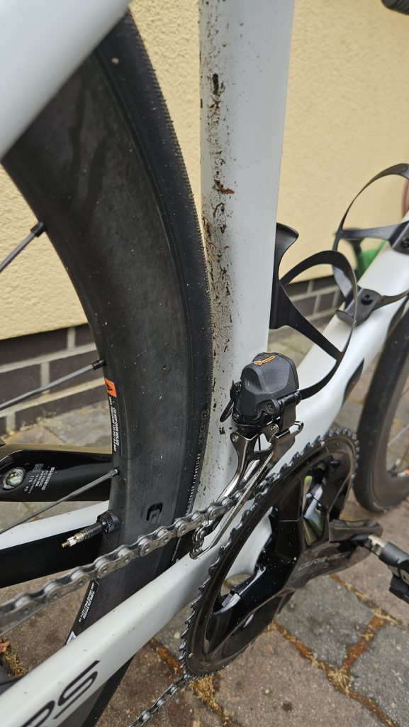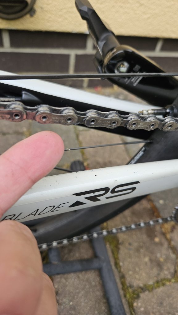 Während der Wartezeig grobe Verschmutzung von den Schaltröllchen und dem Kettenblatt entfernen. Mit einem Zahnstocher kann klebriger Schmutz aus Vertiefungen der Schaltröllchen rausgeholt werden.