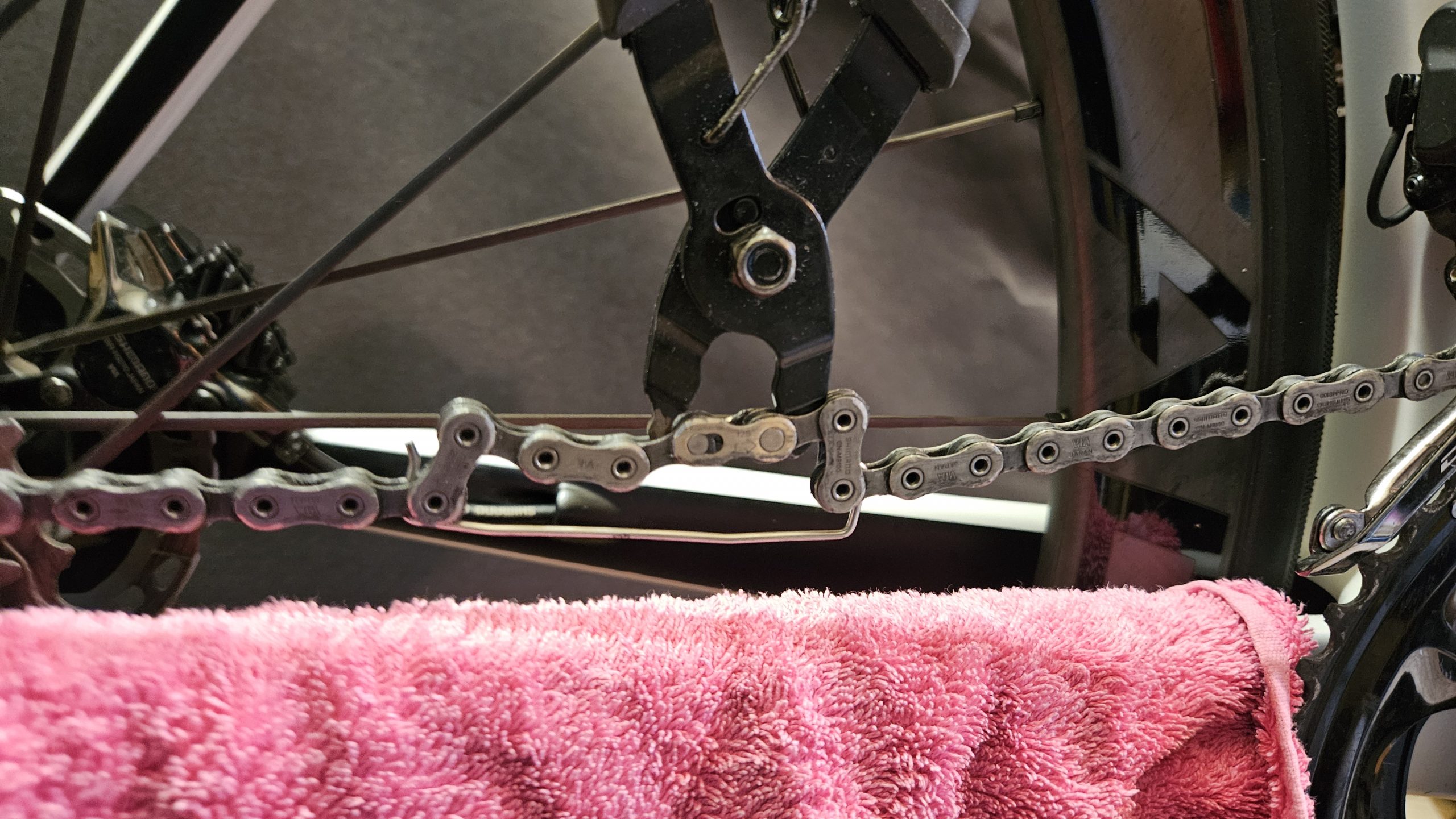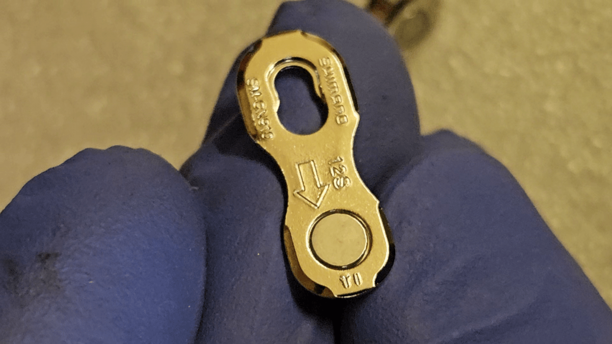 Anschließend das Kettenschloss mit einer Kettenzange öffnen und die Kette abnehmen. Damit die Kette durch die Spannung der Schaltung nicht wegspringt, mit einer Klammer sichern.