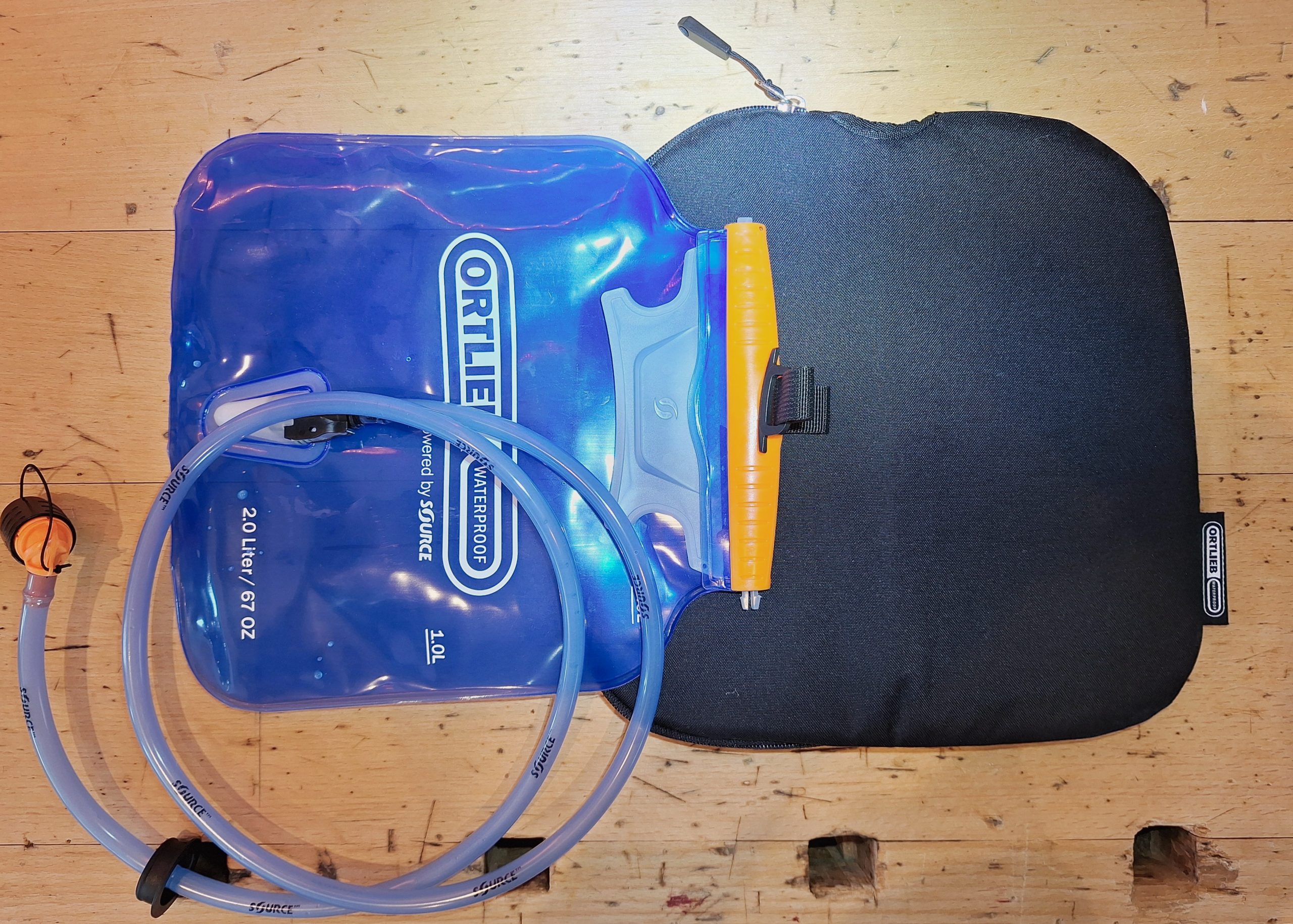 Optional gibt es eine passende Trinkblase mit isolierter Tasche. Zunächst war mir nicht ganz klar, wie ich sie Trinkblase im inneren des Rucksackes befestigen sollte – einfach hineinlegen wollte ich sie nicht. Nach ein bisschen Tüftelei fand ich den kleinen Stift, mit dem sie sich an der Innenseite einhängen lässt ähnlich wie bei der Riemenbefestigung außen. Der Trinkschlauch kann durch eine Öffnung an der rechten Schulter geführt werden, die dank eines am Schlauch befestigten Propfens wieder wasserdicht verschlossen wird.