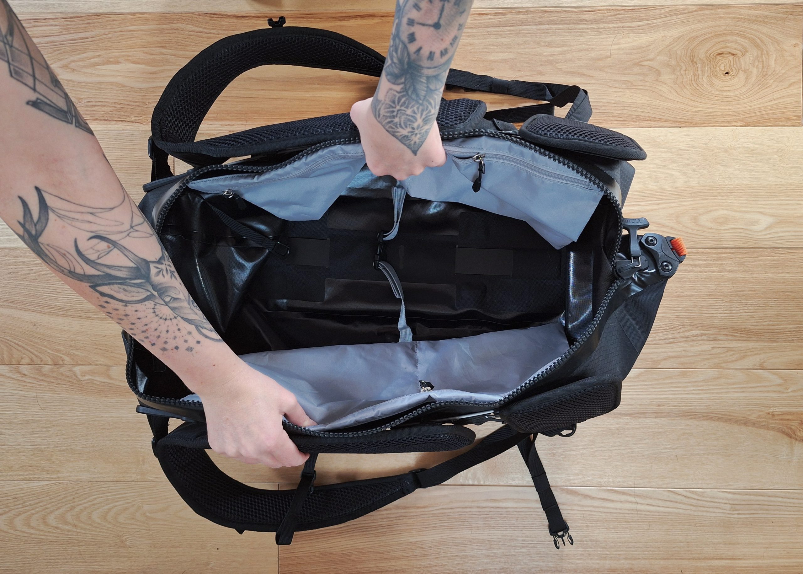 Der große, umlaufende Reißverschluss auf der Rückenseite ermöglicht einen weiten Zugriff – super praktisch! Innen gibt es einen Kompressionsriemen und vier kleinere Fächer mit Reißverschluss für Kleinkram. Außen befinden sich auf beiden Seiten Flaschenhalter mit Spannriemen. Besonders clever: kleine Klettverschlüsse an den Gurten, mit denen sich überstehende Riemen einrollen lassen – kein nerviges Flattern mehr im Fahrtwind. Einzig eine kleine Außentasche zum schnellen Verstauen fehlt mir. Das wäre das i-Tüpfelchen.