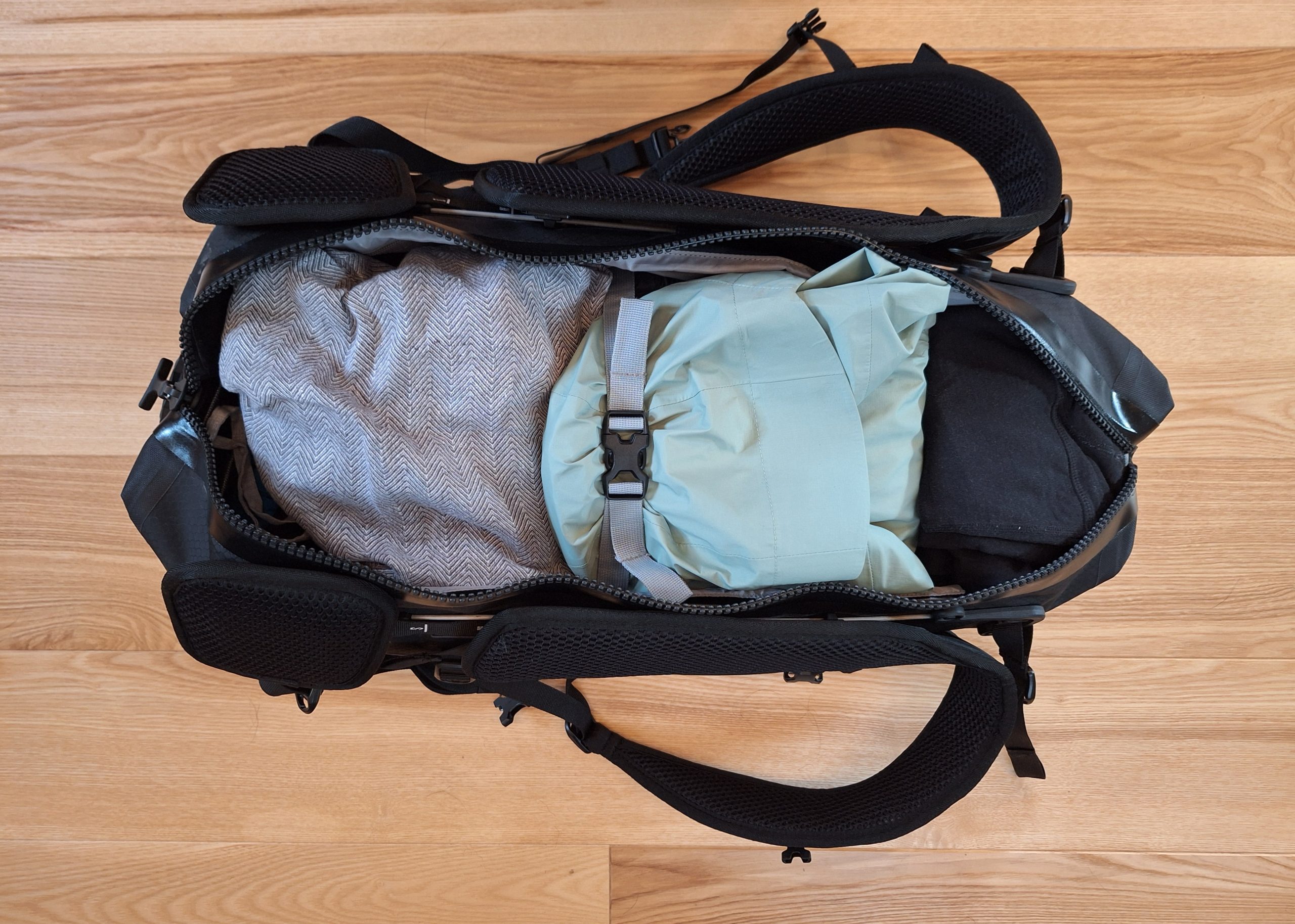 Schlafsack, Isomatte, Kissen, Daunenjacke, Regenjacke, bequeme Kleidung für den Abend, Technikequipment und Co. ließen sich gut verstauen, nichts gequetscht oder gestopft – und es wäre sogar noch etwas Platz für Kleinigkeiten gewesen.