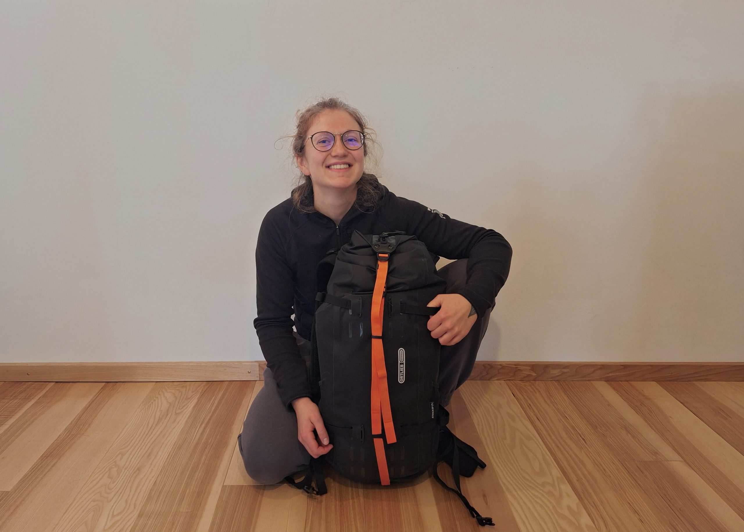 Beim Auspacken war ich allerdings kurz überfordert: überall Riemen und Gurte in Orange und Schwarz. Und das sollen nur 25 Liter sein? Verglichen mit meinem 24-Liter-Wanderrucksack wirkt der Atrack deutlich größer – vermutlich wegen der Form. Bei Wanderrucksäcken nimmt das belüftete Rückensystem oft Platz weg, das ist hier nicht der Fall. Ich bin gespannt, was alles hineinpasst, frage mich aber, ob sich das weiche Rückenteil bei voller Beladung ausbeulen wird.