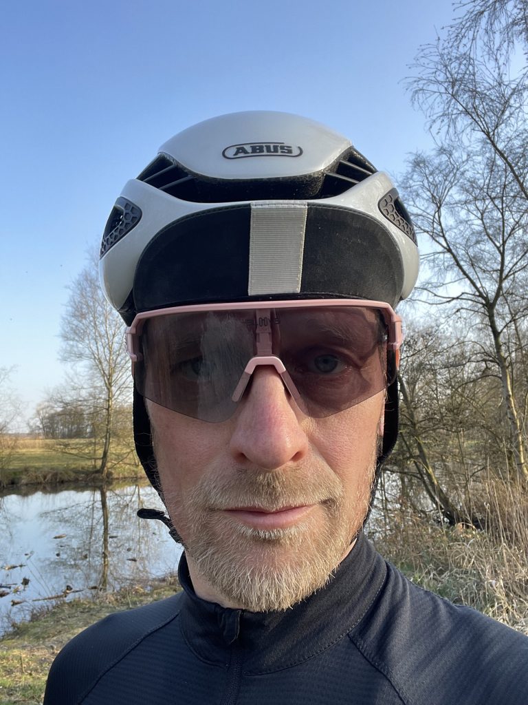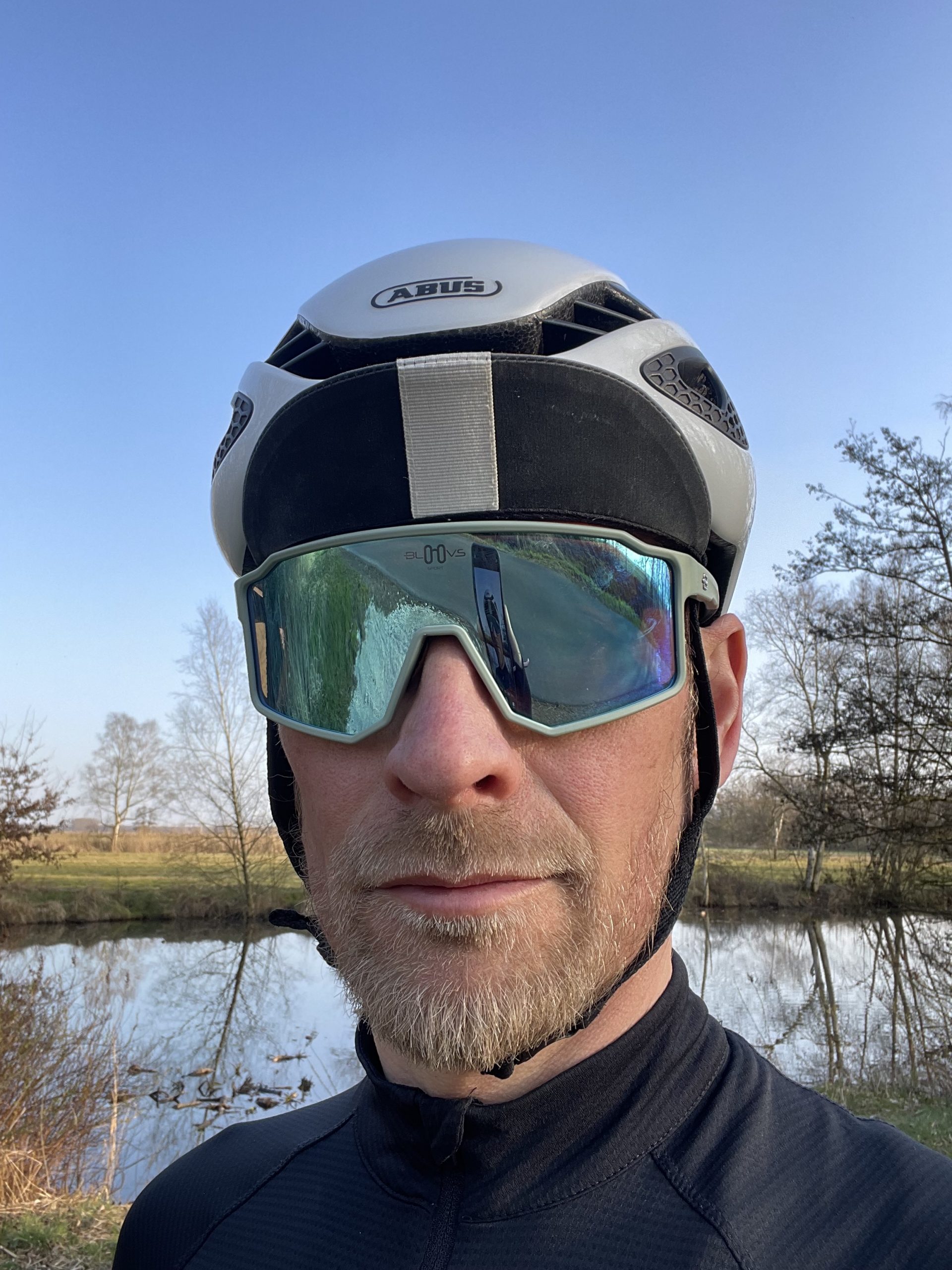 Sowohl die Flanders als auch die Copenhague sind 13,5 cm breit. Die Flanders wiegt 30, die Copenhague kommt wahrscheinlich durch ihr Vollgestell auf 32 gr. Zum Vergleich: die gleich breite Rev React wiegt 40 gr. Die Breite passt auf mein normal bis schlankes Gesicht ganz wunderbar. Allerdings unterscheiden sich die Bügel der beiden Bloovs. Die vollgummierten Abschlüsse der Copenhague gefallen hier besser. Sie sitzt noch ein bisschen rutschsicherer am Kopf. Bei gebeugtem Kopf im Sprint kann die Flanders anfangen, leicht den Halt zu verlieren und etwas auf- und abzuwackeln. Beide Modelle passen ausgezeichnet in die vorderen Lüftungsschlitze des Abus Gamechangers 1. Und sogar einiger maßen gut in die Schlitze hinten am Helm. Die Flanders klappert hier etwas, die Copenhague kaum.