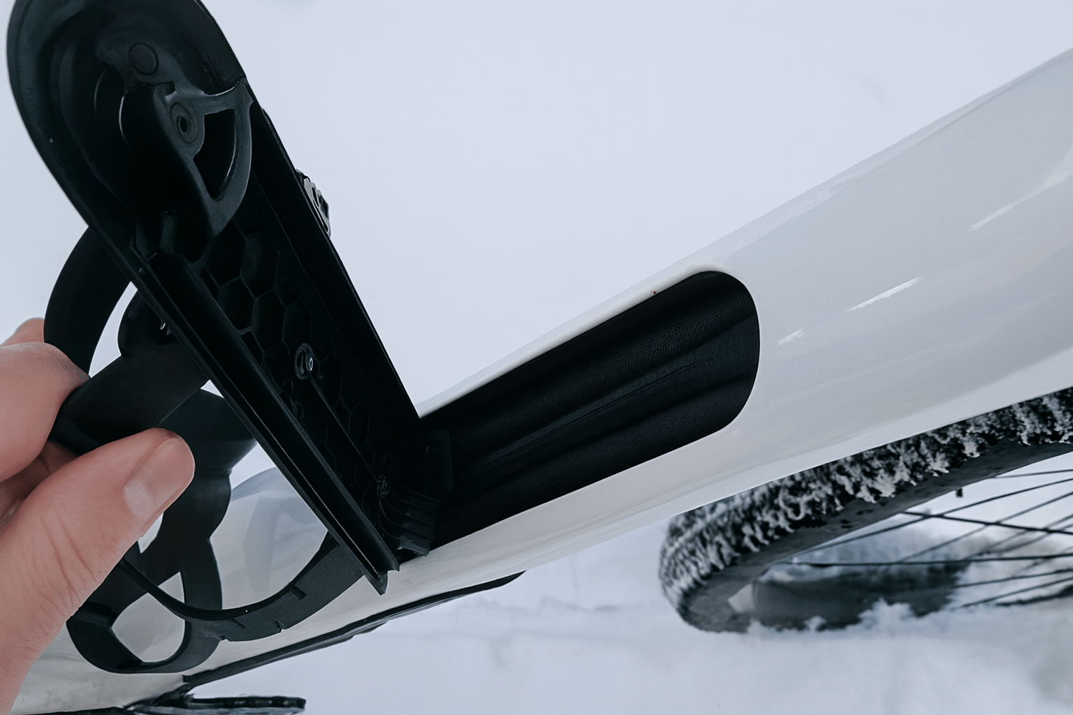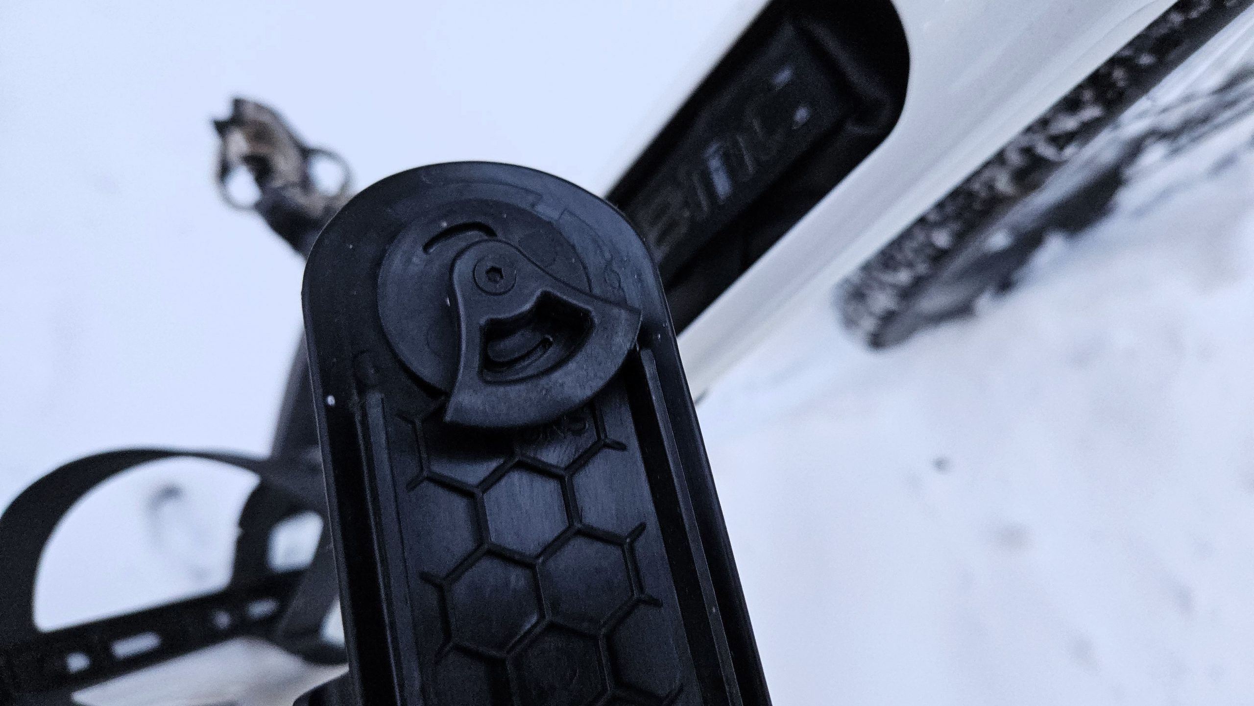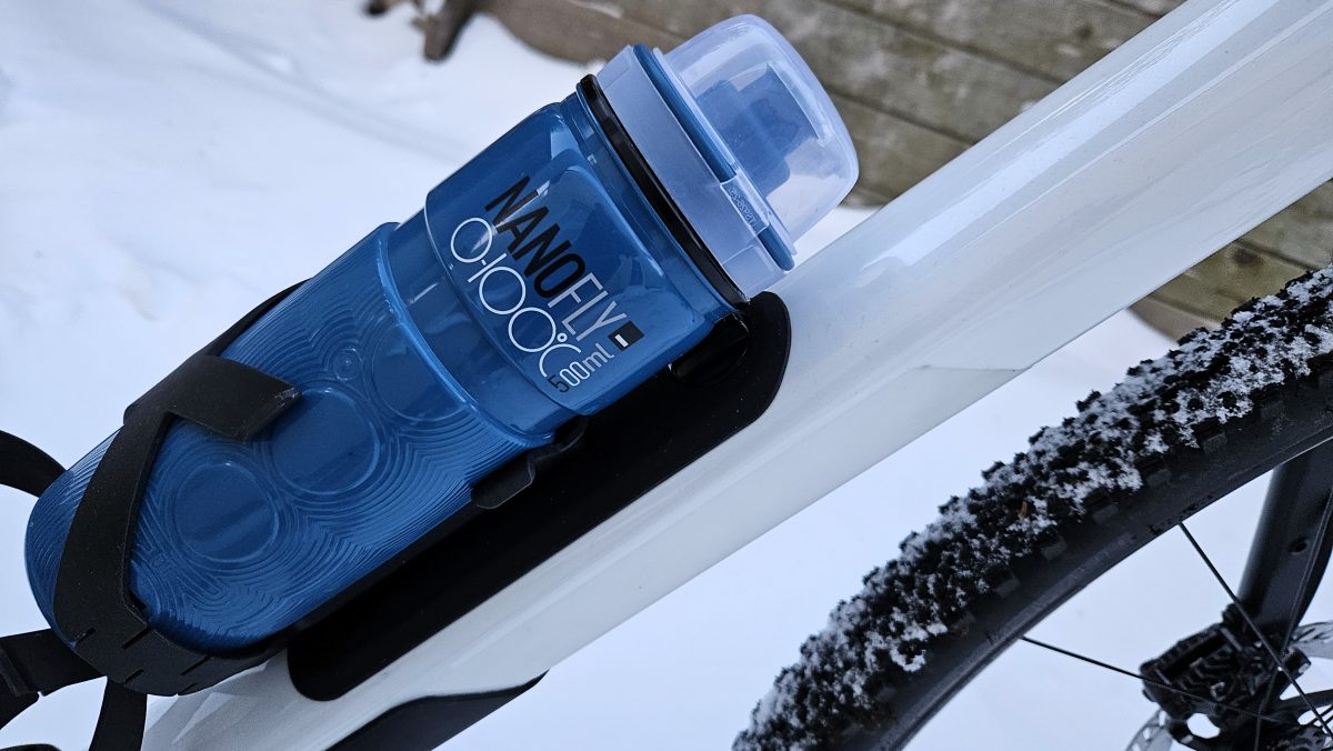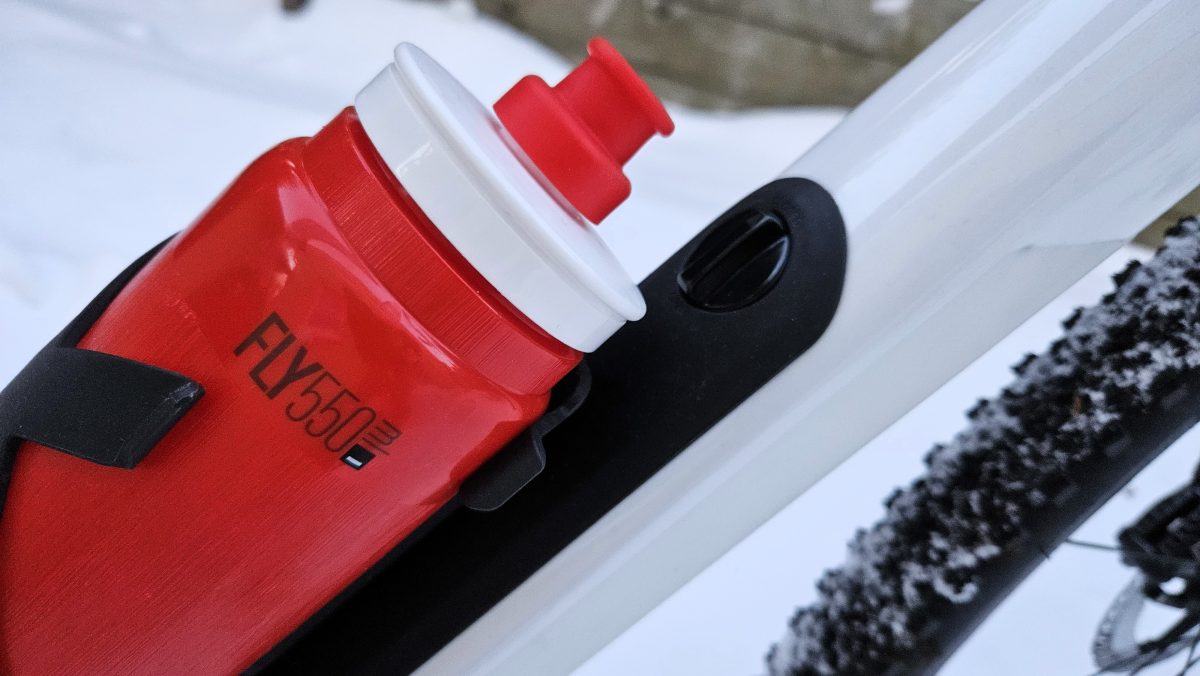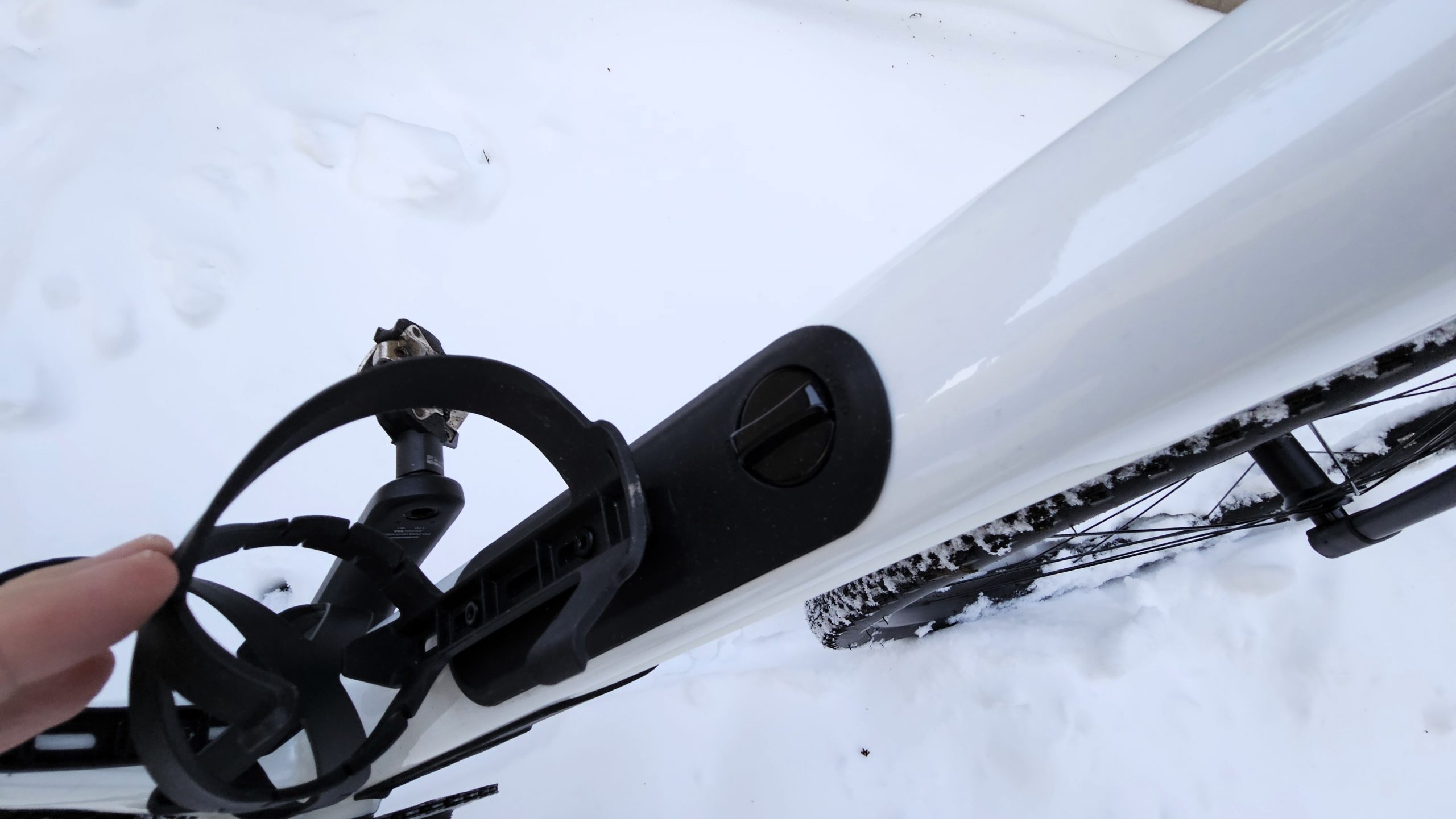 Inzwischen nutzen alle Adventure-Bikes den Hohlraum im Unterrohr als Stauraum. Der lässt sich mit einem Drehverschluss öffnen, was mit dicken Handschuhen allerdings nicht semigut ist. Der kleine Hebel, wie im Rose Backroad ist besser. Allerdings, ist der fast unter der Flasche. Optimal hat Orbea das Öffnen der Klappe gelöst.