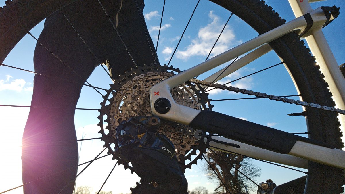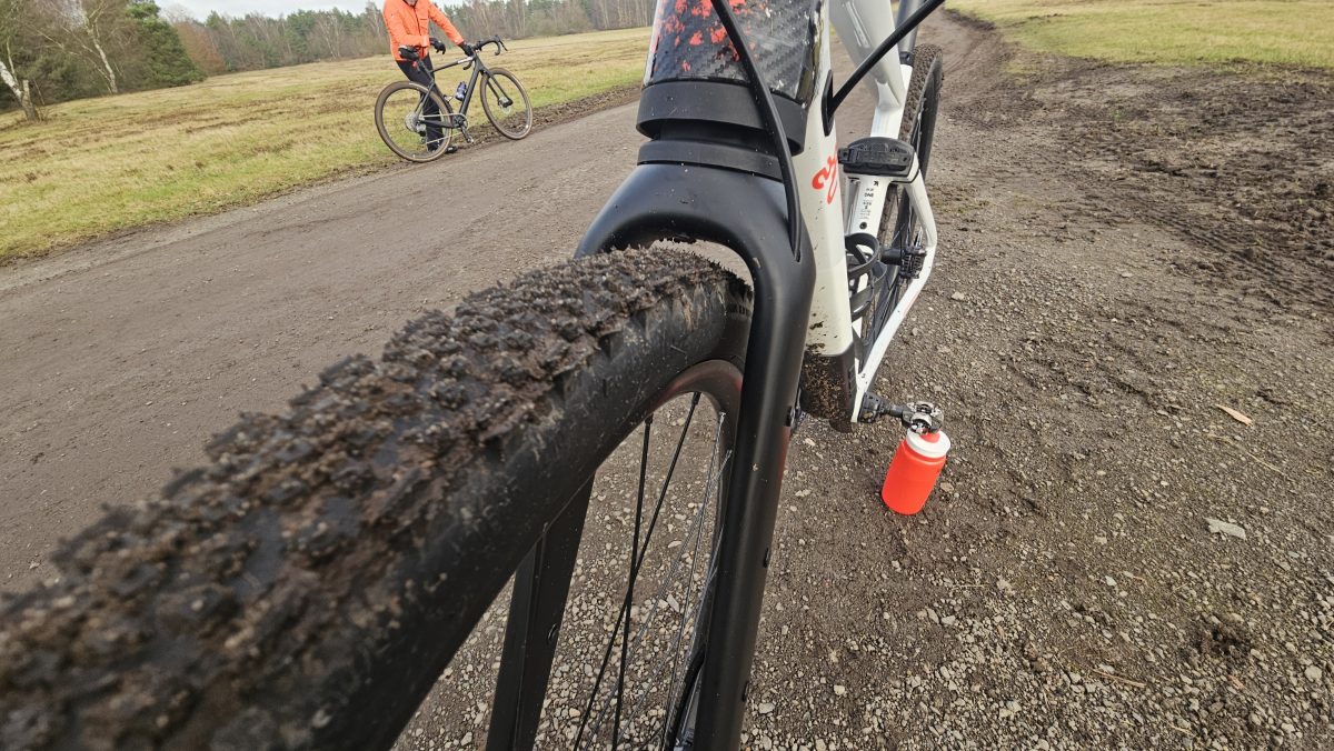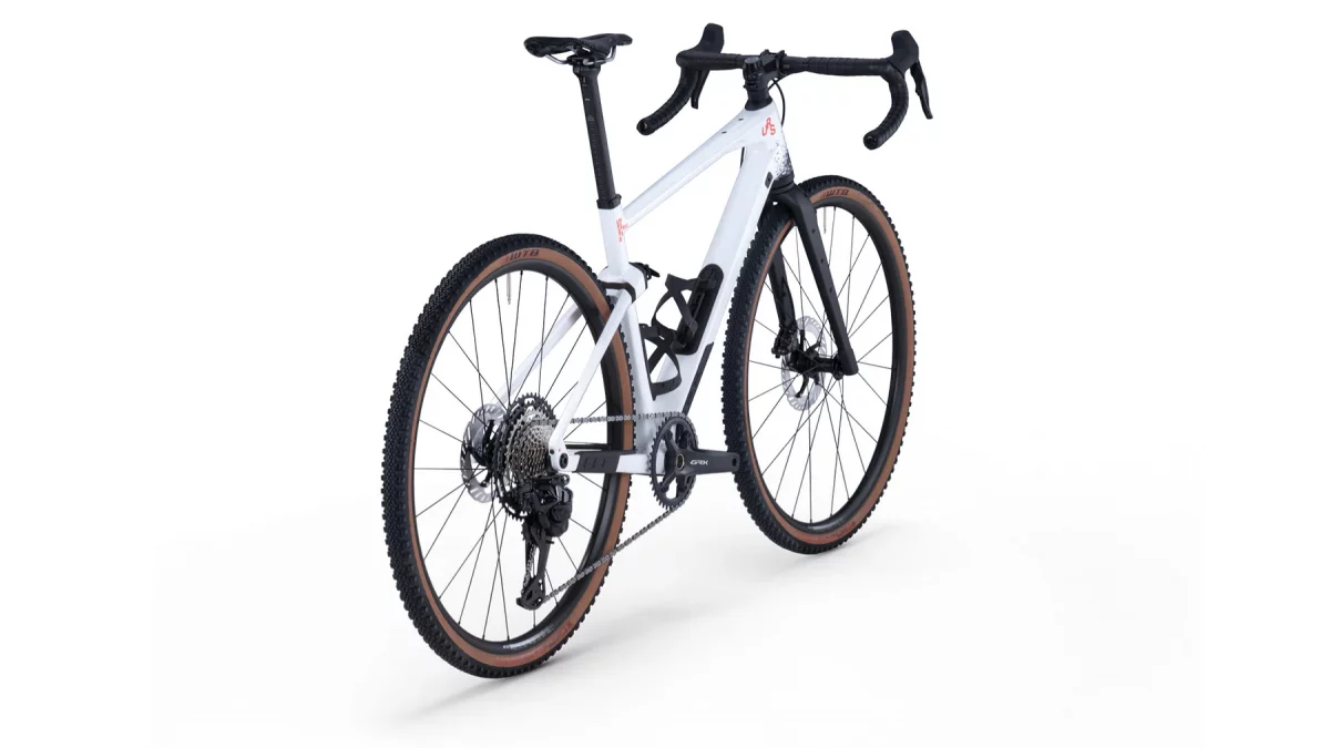Der Carbonrahmen hat fünf Befestigungspunkte für Flaschen und Gepäck und eine Reifenfreiheit von bis zu 47 mm, also für jedes Abenteuer vorbereitet. Im Unterrohr ist der typische Stauraum, darin eine Tasche.