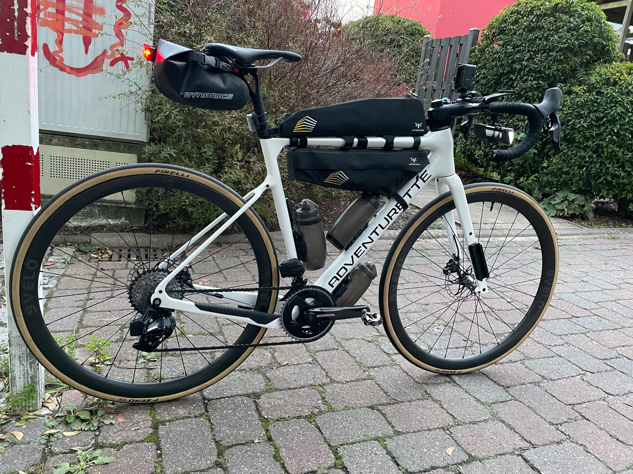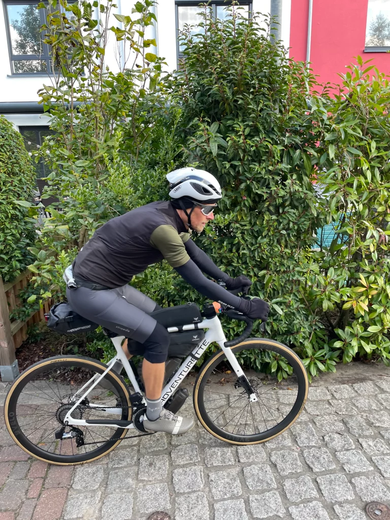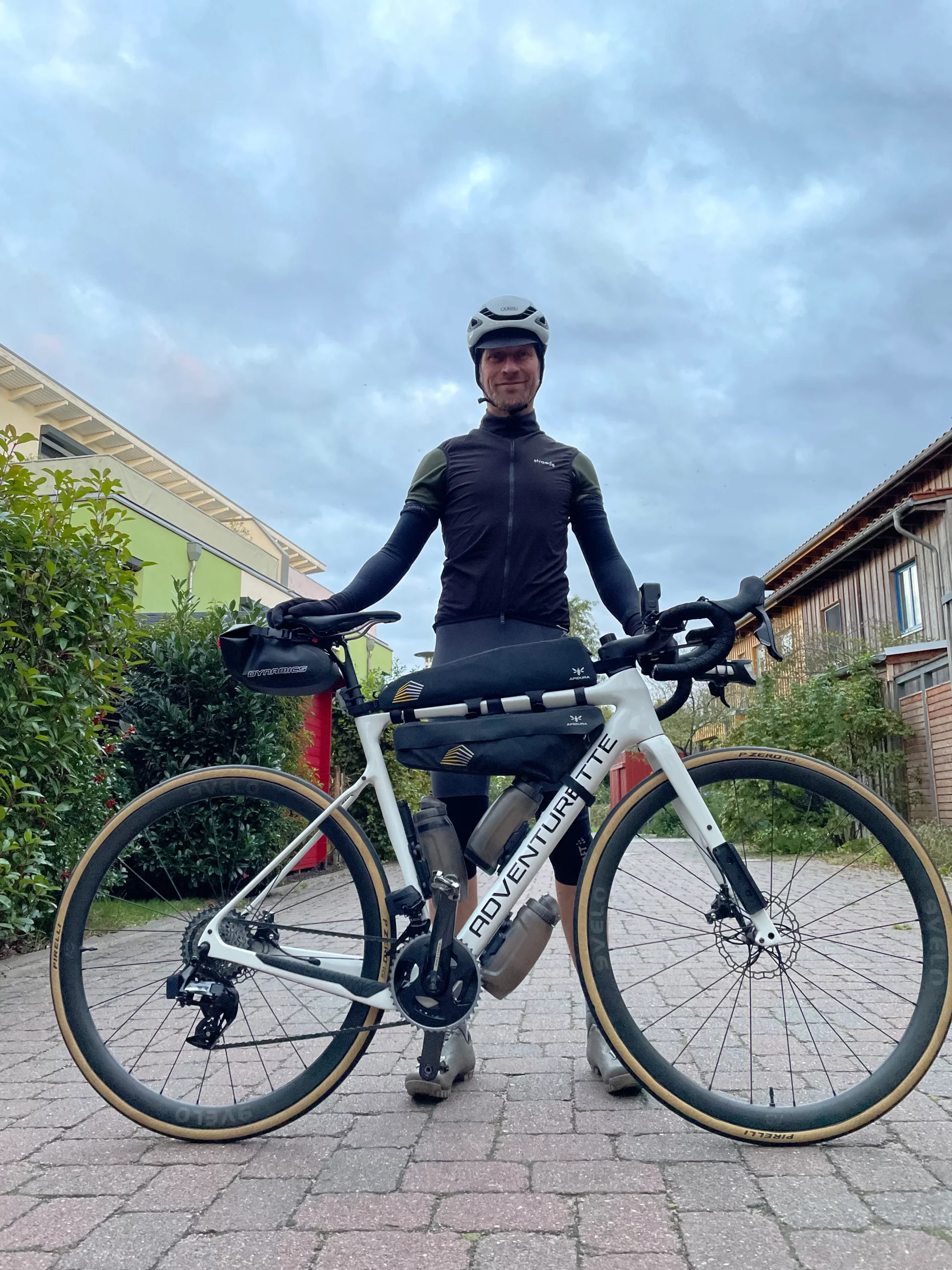 - Kein Tipp, aber wen es interessiert – mein Rad: Ein Gravelrahmen vom chinesischen OEM-Hersteller Lightcarbon, Laufräder von 9Velo. Den Custombuild habe ich mit Sram AXS Force/Rival Komponenten mit 2-fach Antrieb ausgestattet. Gewicht mit Pedale 8,1 kg. Mit allen Ausrüstungsgegenständen und vollen Flaschen kam die Rig auf 14,5 kg.