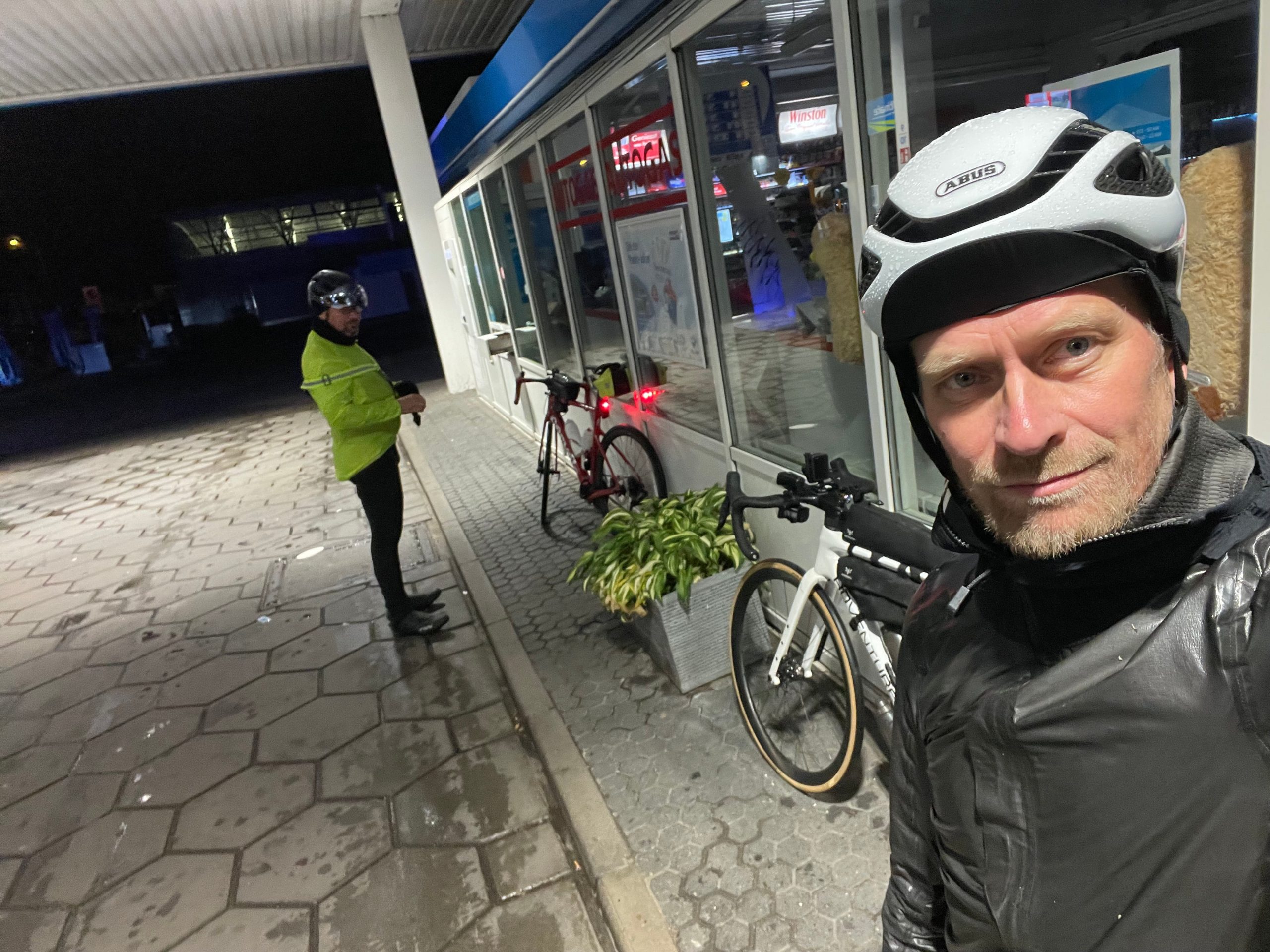 Ich spare an Tims Hinterrad circa 30 bis 40 Watt. Ohne dass wir darüber reden, pendelt sich zwischen uns ein Wechselrhythmus im 30 Minutentakt ein. Die ersten 100 km gehen mit einem Schnitt von fast 30 km/h rasend schnell dahin. In Peine, Kilometer 148, wollen wir in einer der 24/7 Tankstellen eine erste Kaffeepause machen und uns ein wenig wärmen, denn die Temperatur ist mittlerweile auf 5 Grad gesunken. Die Tanken sind jedoch alle im SB-Betrieb – aus der Pause im Warmen wird nichts. Nach 172 Kilometer finden wir in Salzgitter eine Aral und der Kassierer lässt uns rein, aber auch nur, weil ein Taxifahrer ihm am Nachtschalter sagt, er solle sich nicht so anstellen.