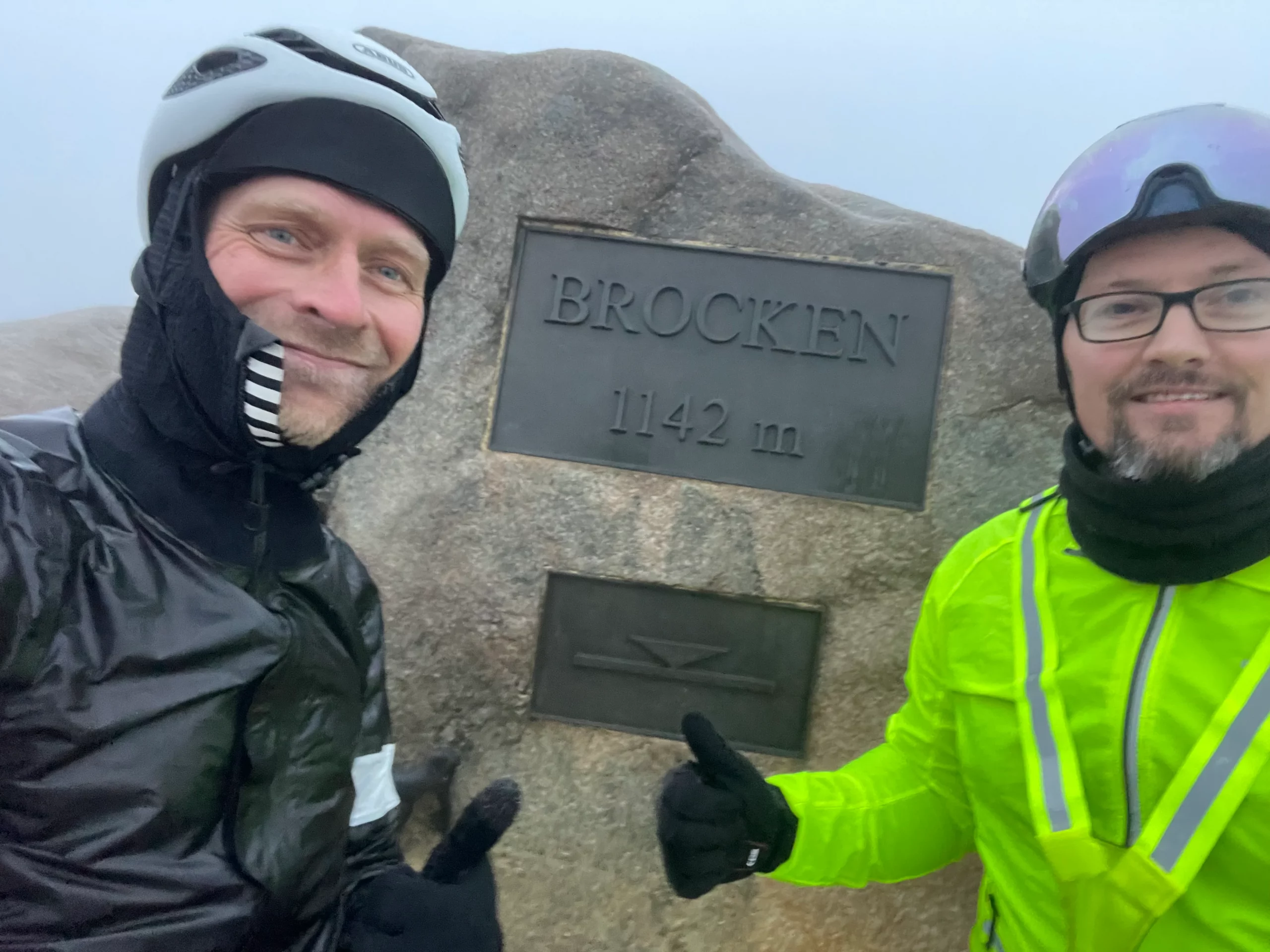 Der Anstieg zum Brocken nach 230 km Strecke ist hart. Er zieht sich 27 Kilometer hin mit bis zu 14% Steigung. Tim hat in fast allen Beinmuskeln Krämpfe. 10 Kilometer vor dem Gipfel lässt er mich fahren und überlegt, auszusteigen. Der Gipfel wird von einem Nebeldunst umwabert, der so dicht ist, dass man kaum die Hand vor Augen sieht. Und die Temperatur fällt auf 1 Grad. Das Szenario ist fast ein bisschen gespenstisch.