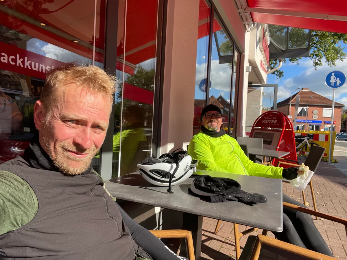 Tim möchte 115 Kilometer vor Bremen aussteigen. Wir machen eine Pause an einer Bäckerei. Ich war zuletzt viel vorne gefahren. Woher weiß ich nicht, aber in mir ist auf einmal wieder Kraft und Fokussiertheit. Tim lässt sich mitreisen, wofür ich dankbar bin. So wird mein Hinterrad seine Rettung und seine Anwesenheit gibt mir die Zuversicht und Sicherheit, die ich jetzt brauche. Wir schaffen es tatsächlich bis ins Ziel.