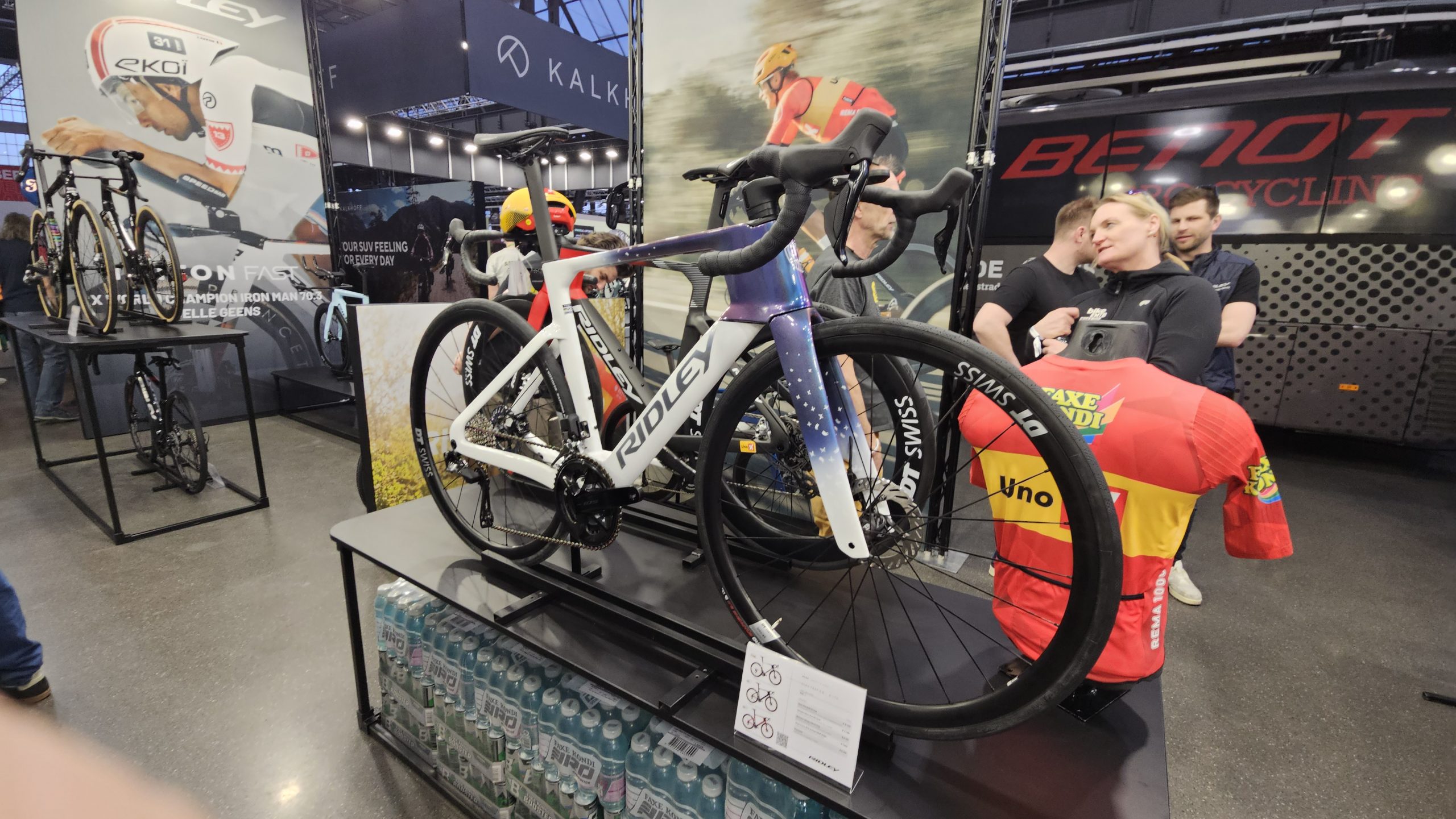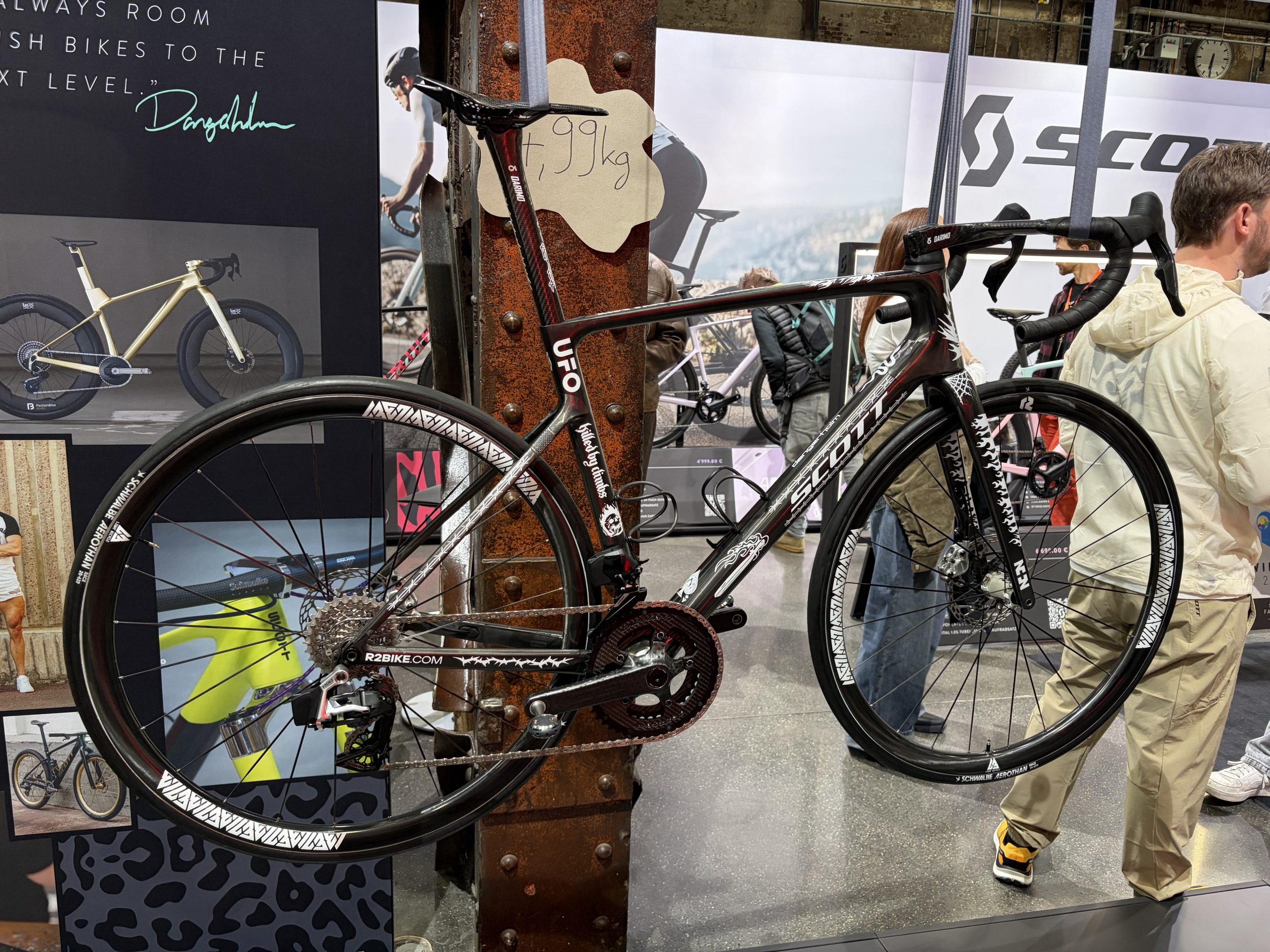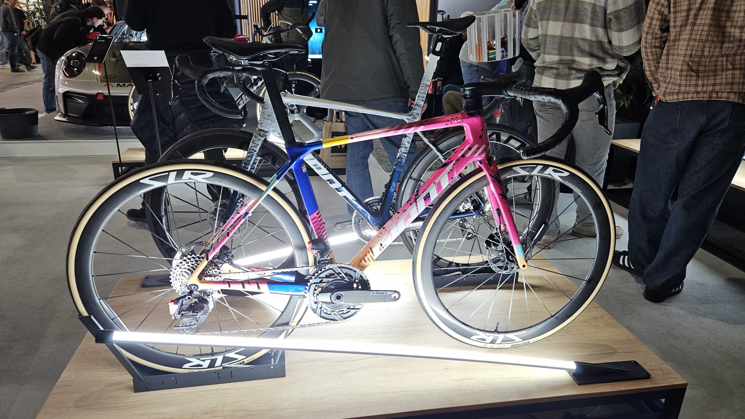 Auch bei den Rahmen gab es echte Hingucker: Factor zeigte das limitierte Bugatti‑Modell, Rose das neue Shave FF mit nur 6,6 kg und Scott brachte mit Dangerholms Addict ein 4,99‑kg‑Bike auf die Messe. Giant stellte das neue Propel und ein farblich auffälliges TCR vor, während Baldiso mit dem Anspruch „schnellstes Rad der Welt“ zur Messe kam.