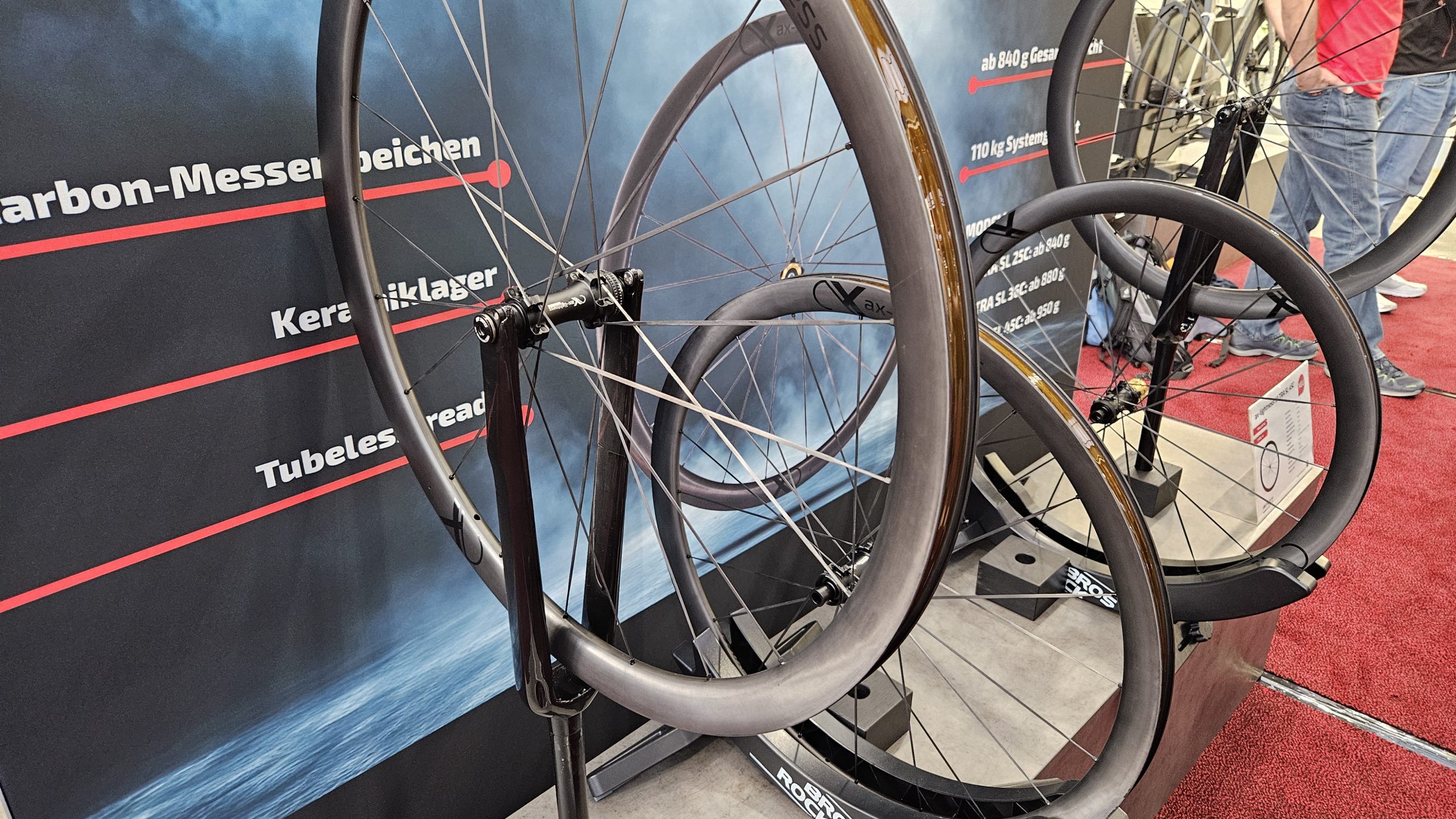Ein Highlight waren die neuen AX‑Laufräder mit nur 880 Gramm Gewicht. Damit setzt der deutsche Carbon‑Spezialist erneut Maßstäbe im Leichtbau. Zipp ging einen anderen Weg und zeigte mit dem 454 NSW und Pirelli ein aerodynamisches Laufradkonzept, das optisch und technisch an die Formel 1 erinnert. Die Diskussion „Gewicht vs. Sicherheit“ spielte dabei eine zentrale Rolle, der 2026 viele Hersteller beschäftigt.