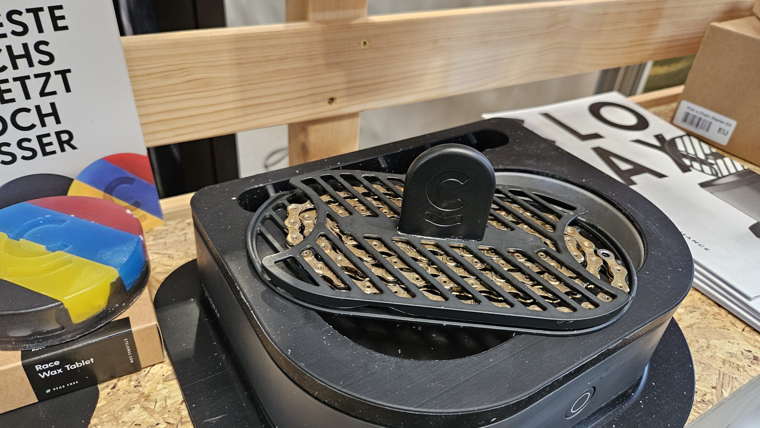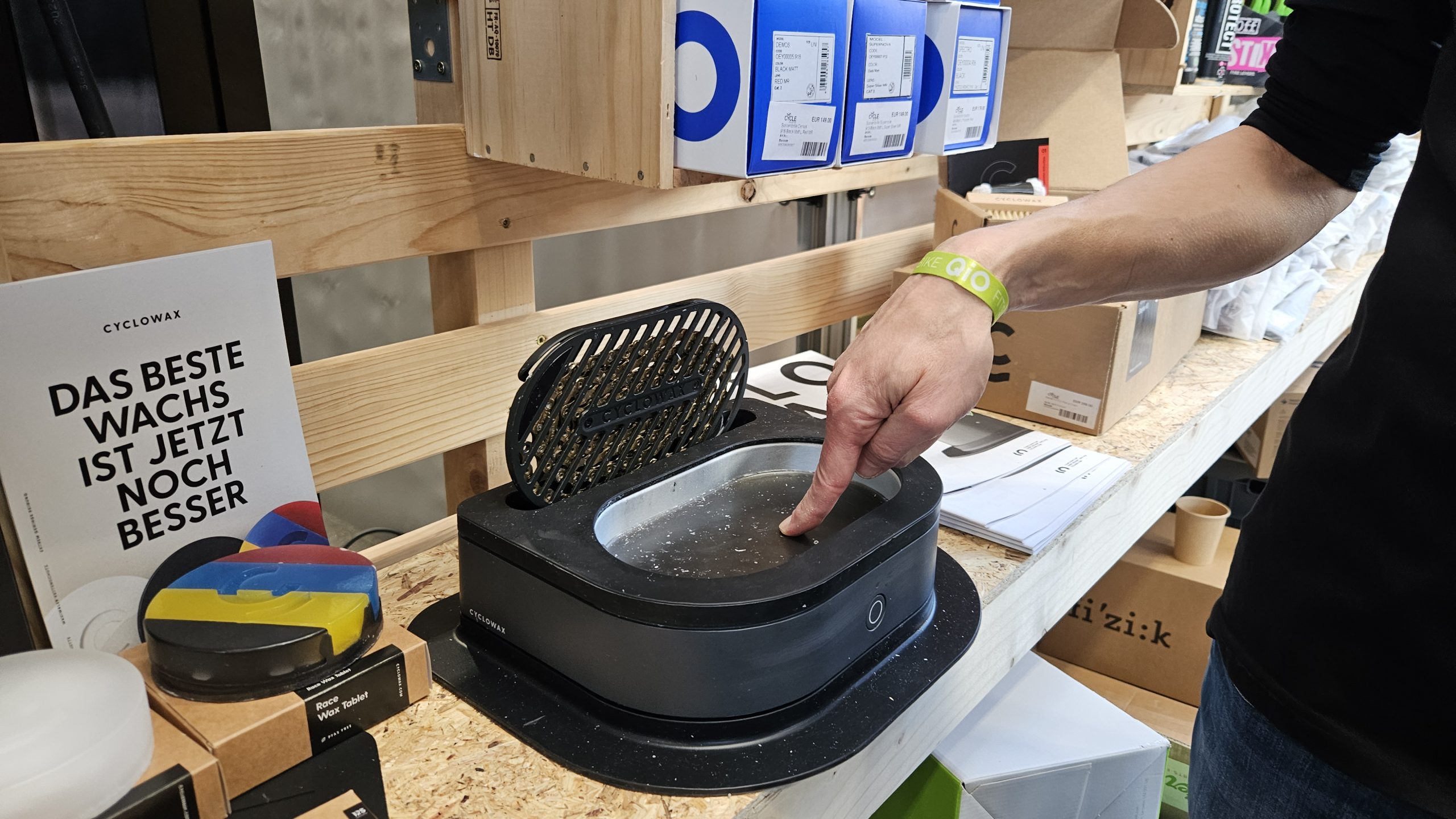 Kettenwachs von Optimize oder Cyclowax? Beide überzeugen. Der neue Kocher von Cyclowax ist allerdings gerade für Radsportler wie mich eine gute Wahl. Im Laden, wo wir immer mehrere Ketten wachsen, verwenden wir dagegen die Ultraschallkocher von Optimize.