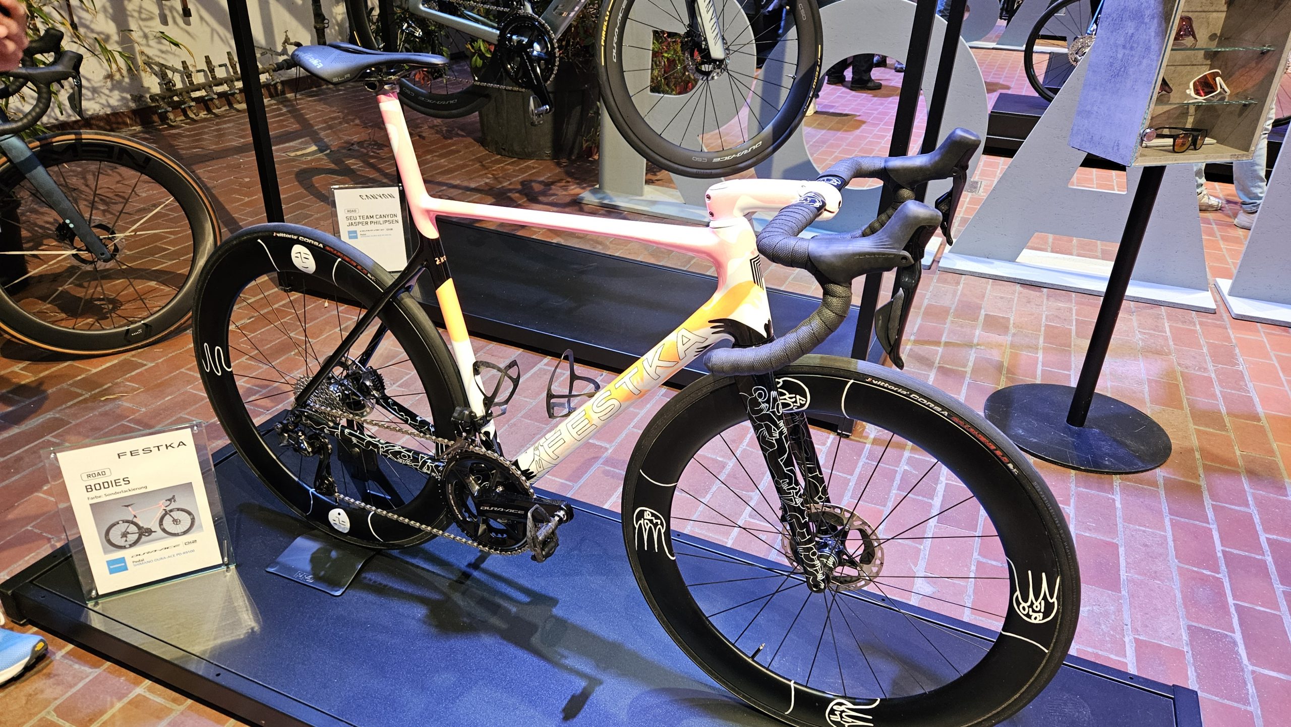 Die tolle Lackierung ist eins, Factor unterscheidet sich aber vor allem mit einem echten Fortschritt beim Rahmenbau. Auch das Factor Bugatti war in Düsseldorf und jeder konnte eines der auf 250 Stück limitierten Exemplare anfassen. Wer 25.800 Euro für ein Rennrad auf den Tisch legt, kann damit auf der nächsten RTF angaben (Foto).