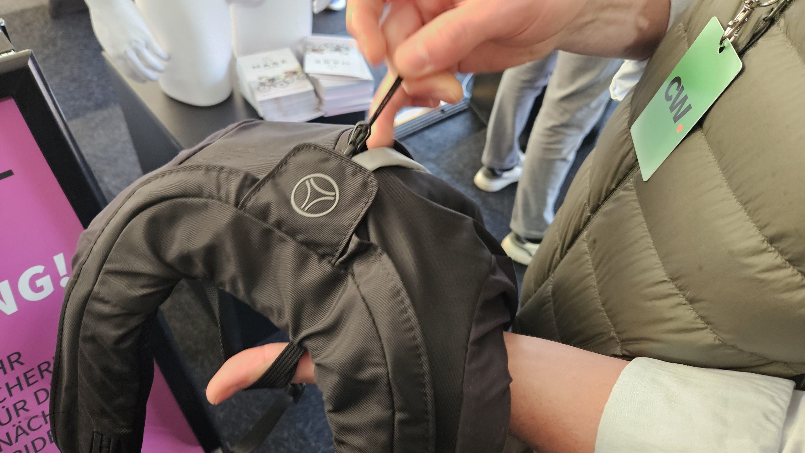 Am Stand von Mase haben wir den Airbag-Rucksack live sehen können. Mase sind die Anfangsbuchstaben von Minerva Airbag Systems Erding. Minerva ist das Unternehmen, welches den Sensor entwickelt hat. Der überwacht 300 Mal pro Sekunde Bewegung, Neigung und Beschleunigung. Kommt es zu einem Unfall, bläst sich der Airbag in 150 Millisekunden auf. Für 499 Euro mit Stauraum oder 549 Euro als Miniversion gibts Sicherheit beim Sturz. Das Ganze wiegt 1 kg bzw. 1,5 Kilogramm. Ob sich sowas durchsetzen wird?
