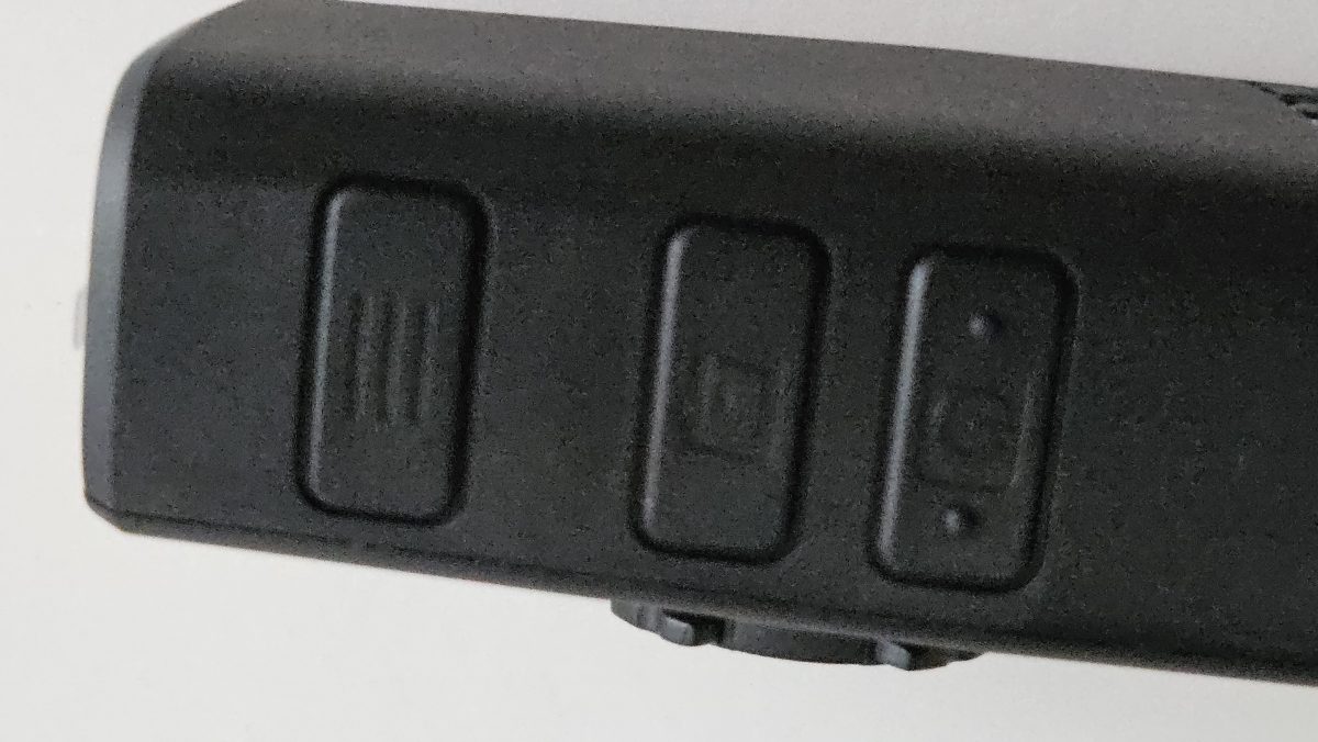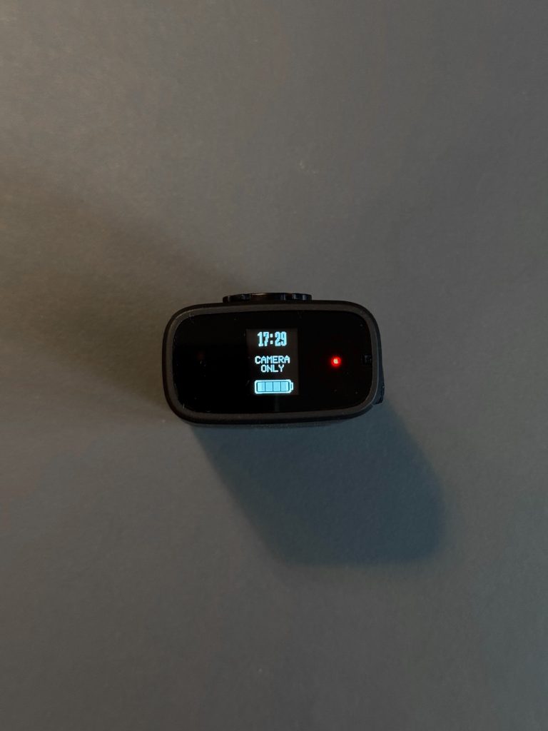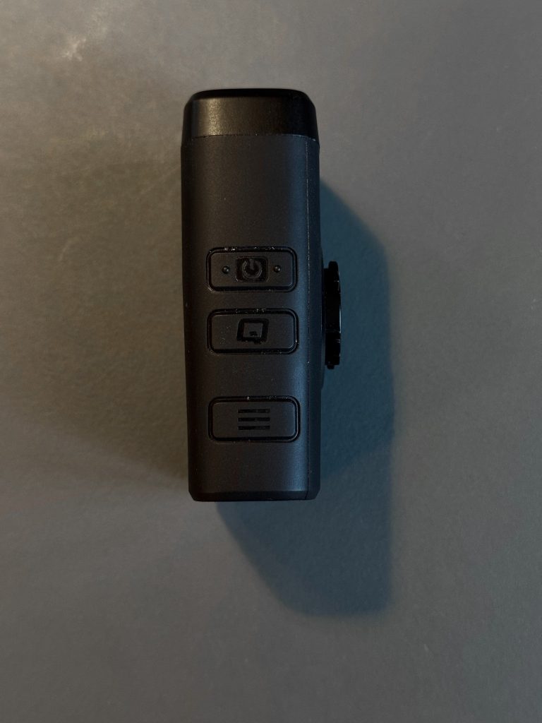 Die Fly12 hat 3 Knöpfe und ein kleines Display auf der Rückseite. Mit dem Power Knopf schaltet man sie Ein- und Aus und wechselt auch die Lampen Modi. Mit dem Q Knopf löst man die Video-Sicherheitsfunktion aus: die aktuelle Aufnahme wird gegen Löschen geschützt. Über das Hamburger Menü kann man die Ausrichtung festlegen, die SD Karte formatieren oder das Gerät komplett zurück setzen.
