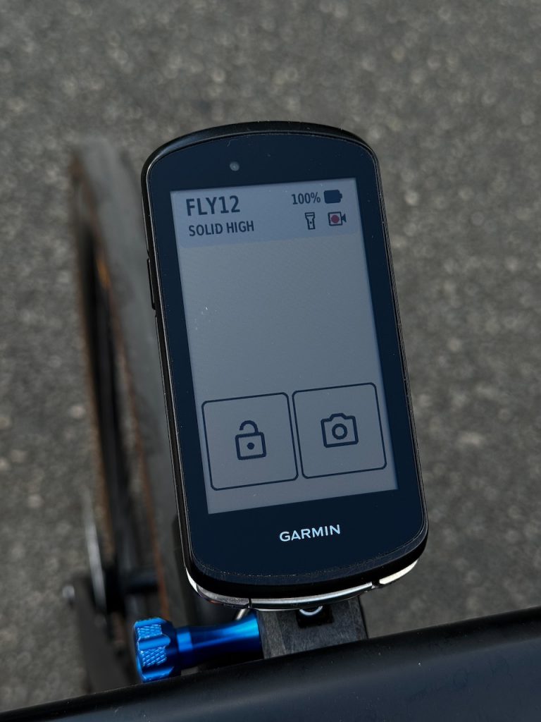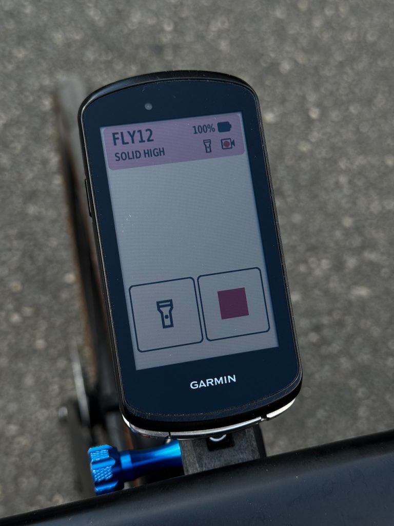 Die Fly12 kann auch mit einem Garmin Radcomputer verbunden werden. Dafür gibt es eine Connect IQ App von Cycliq. Mit dieser erhält man ein eigenes Widget, über das man die Kamera und das Licht steuern kann. Dies ist besonders praktisch, wenn die Kamera unter dem Lenker montiert ist und man das kleine Display nicht gut sehen kann. Über Bluetooth LE schaltet sich die Kamera auch automatisch mit dem Garmin ein. Optional schaltet sich die Kamera nach 15 Minuten ohne Bewegung aus, um Strom zu sparen. Praktisch, man muss nur nach der Kaffeepause daran denken, sie wieder zu aktivieren.