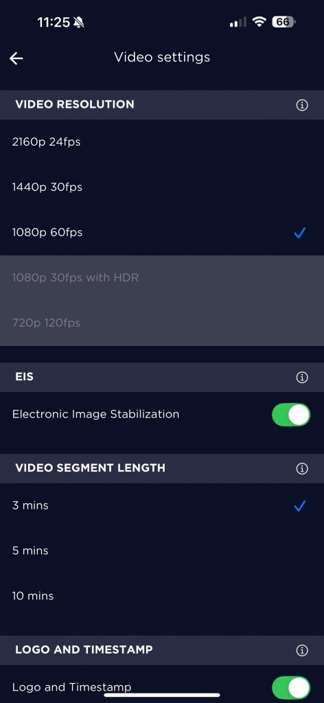 Die Dashcam bietet 5 verschiedene Video Modi: 2160p @ 24FPS, 1440p @ 30FPS, 1080p @ 60FPS, 1080p @ 60FPS mit HDR und 720p @ 120 FPS. Die beiden letzteren funktionieren nicht zusammen mit der elektronischen Bildstabilisierung.