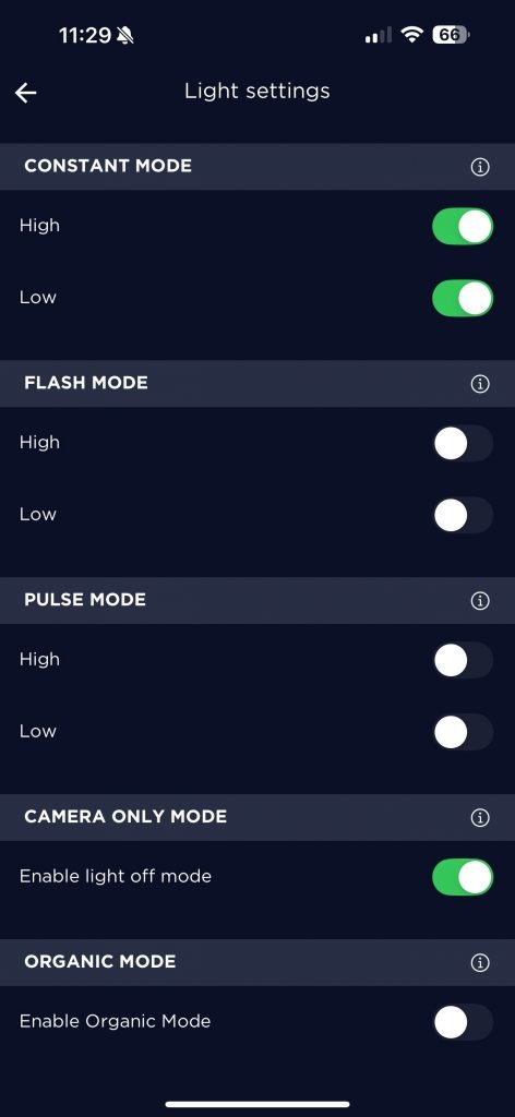 Das Licht kann in 2 Helligkeiten entweder konstant Leuchten oder blinken bzw. pulsieren. StVZO zugelassen ist das Licht damit nicht. Nicht benötigte Modi kann man einfach in der Konfiguration deaktivieren. Sehr praktisch, wenn man zum Beispiel kein Blinken möchte.