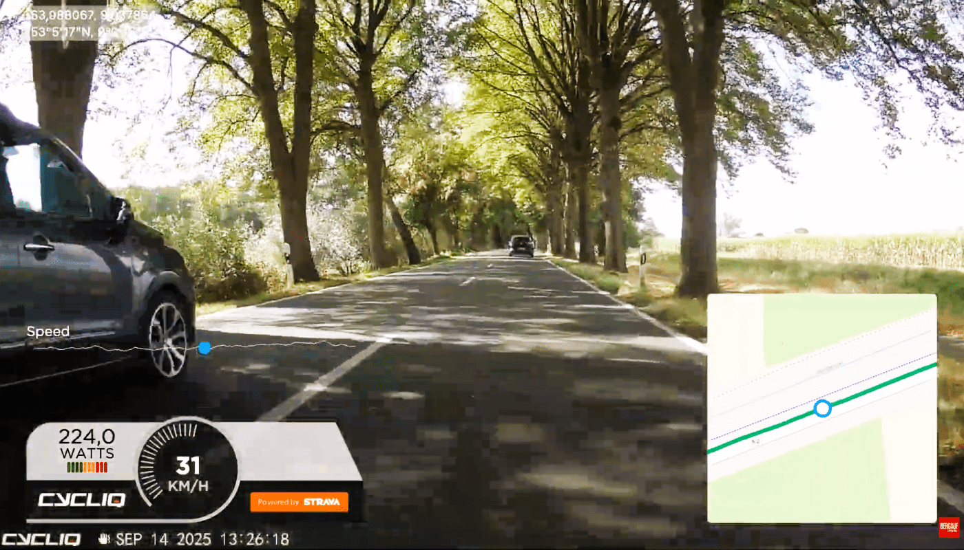 Die App bietet auch eine Funktion, die Videos zu bearbeiten. Da es aber tatsächlich keine Möglichkeit gibt die Videos direkt von der Kamera auf das Handy zu übertragen, muss man umständlichen den Umweg über einen Computer nehmen. Das ist 2025 nicht mehr zeitgemäß. In die Videos kann man mit der App verschiedenen Daten wie die Geschwindigkeit oder den Abstand von überholenden Autos einblenden. Das ist ganz nett aber um mal schnell ein Video bei Strava oder Instagram zu teilen ist der Workflow zu kompliziert.