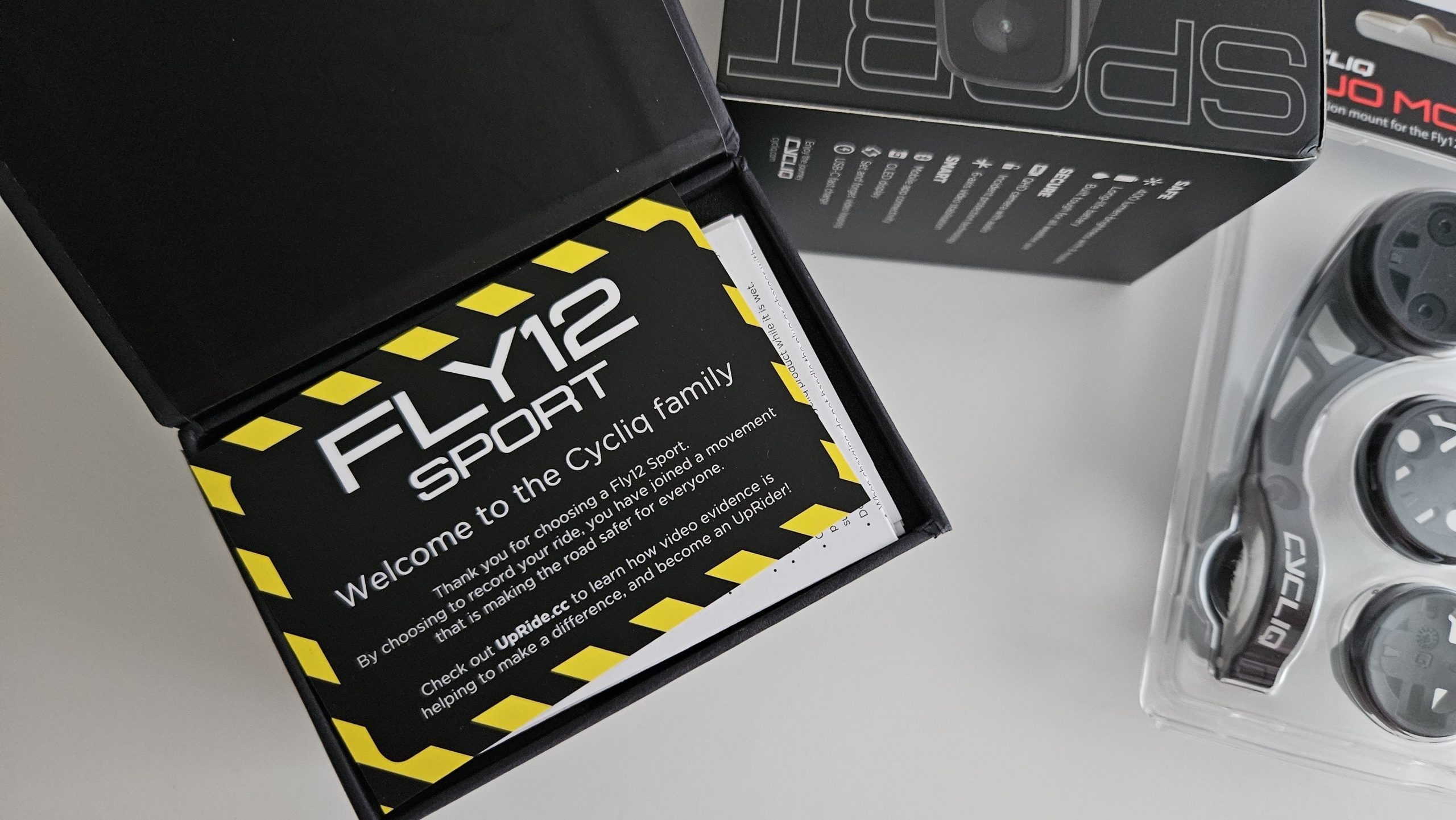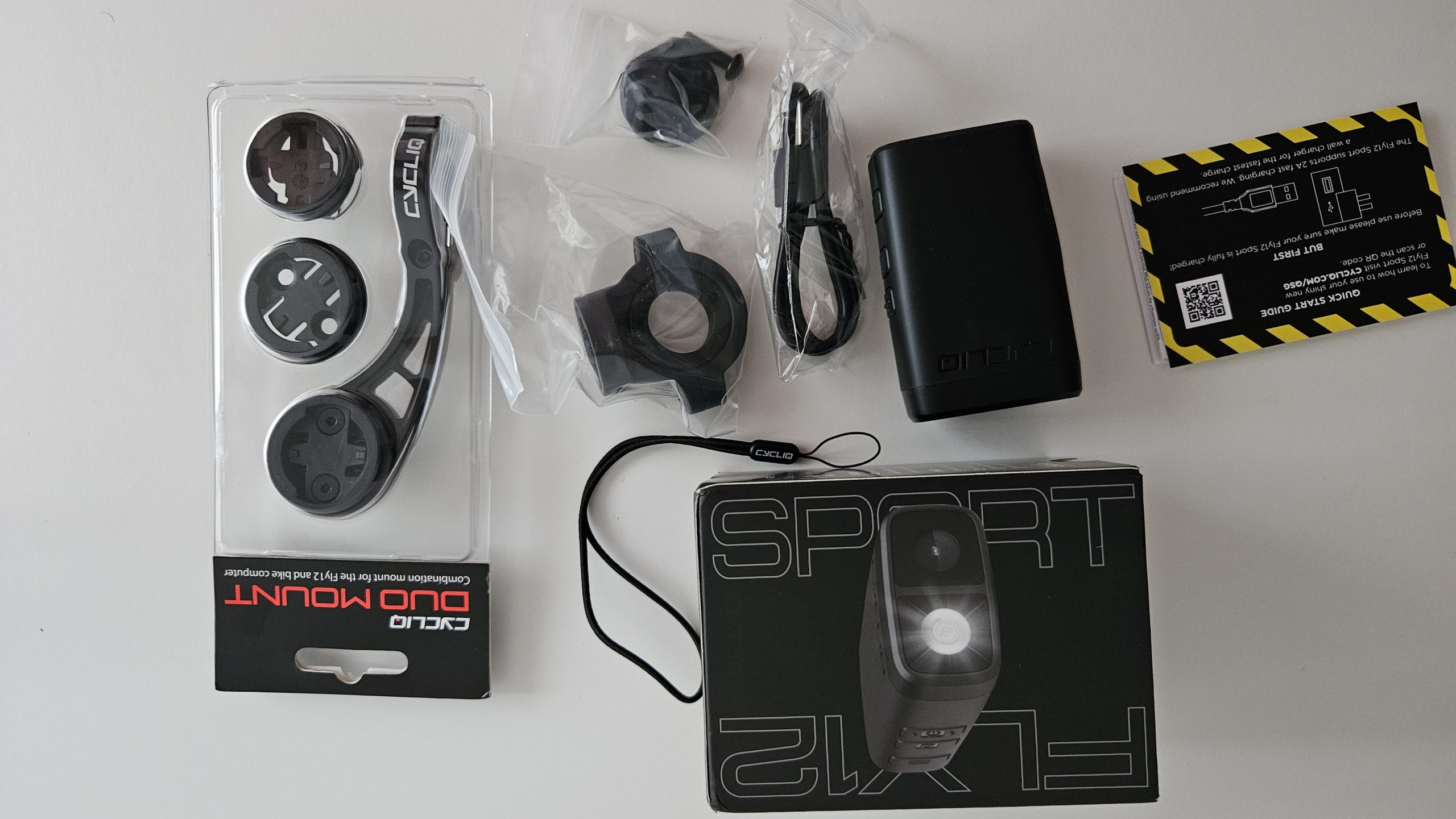 Die Cycliq Fly12 wird mit allem Zubehör, das man für den Einsatz braucht, geliefert. Neben der Kamera sind eine 64GB Speicherkarte, ein Ladekabel, ein Lanyard, ein GoPro Mount Adapter und eine Lenkerhalterung in der Box. Eine Duo Halterung für Radcomputer und Fly12 ist separat erhältlich. Da die Fly12 über einen üblichen GoPro Mount montiert wird, kann man aber jede Halterung verwenden, die ebenfalls über diesen verfügt. Praktisch!