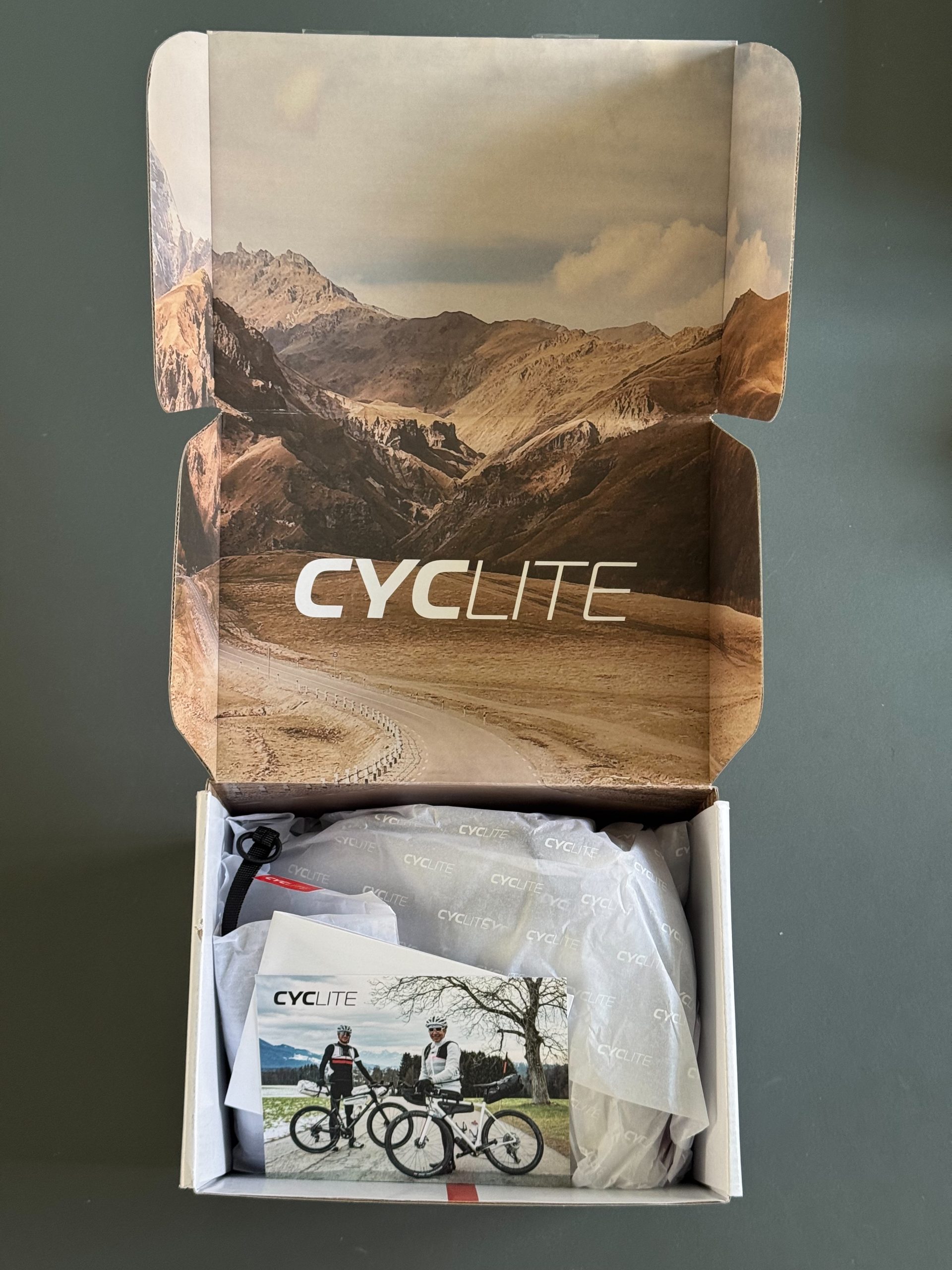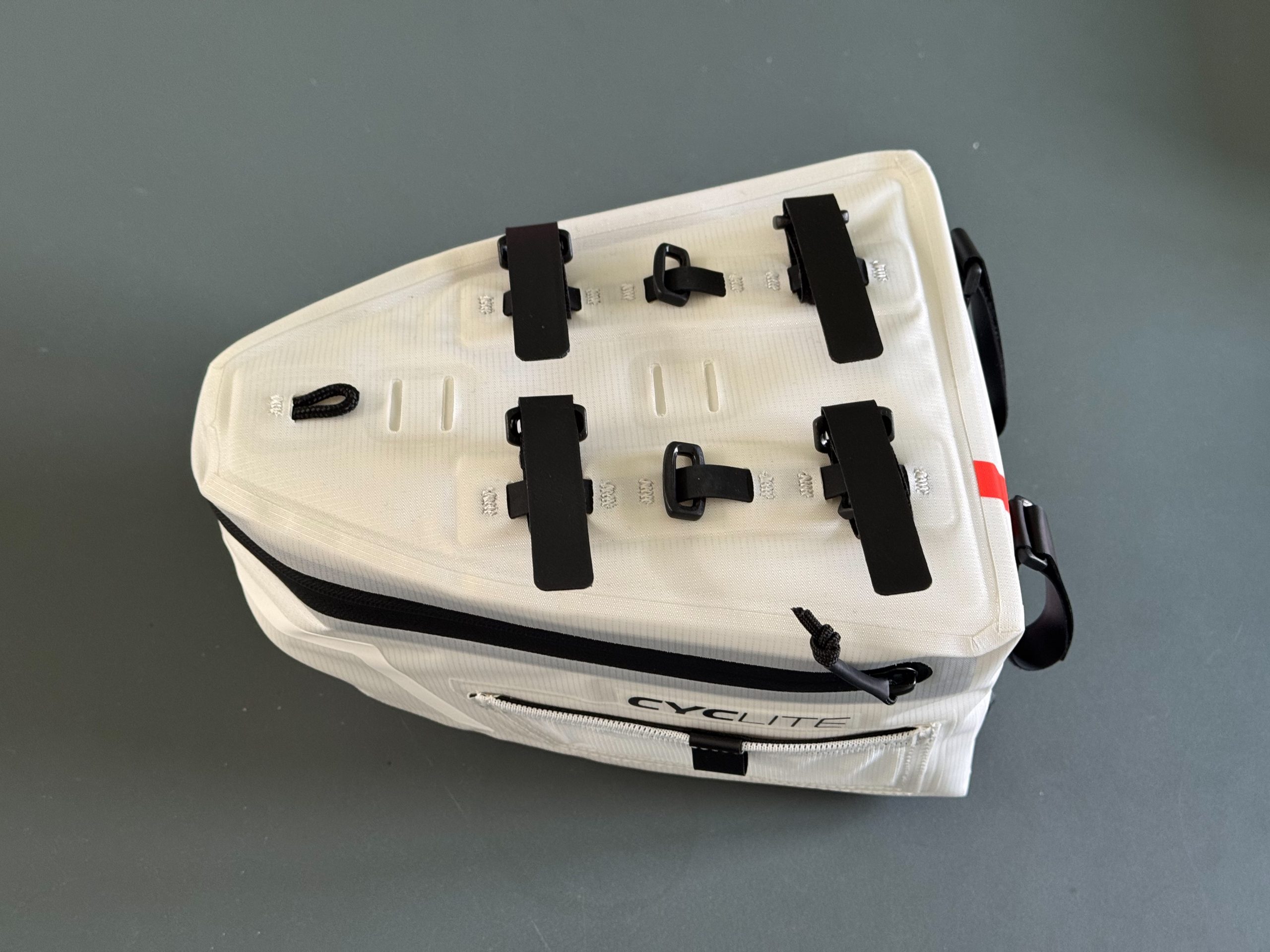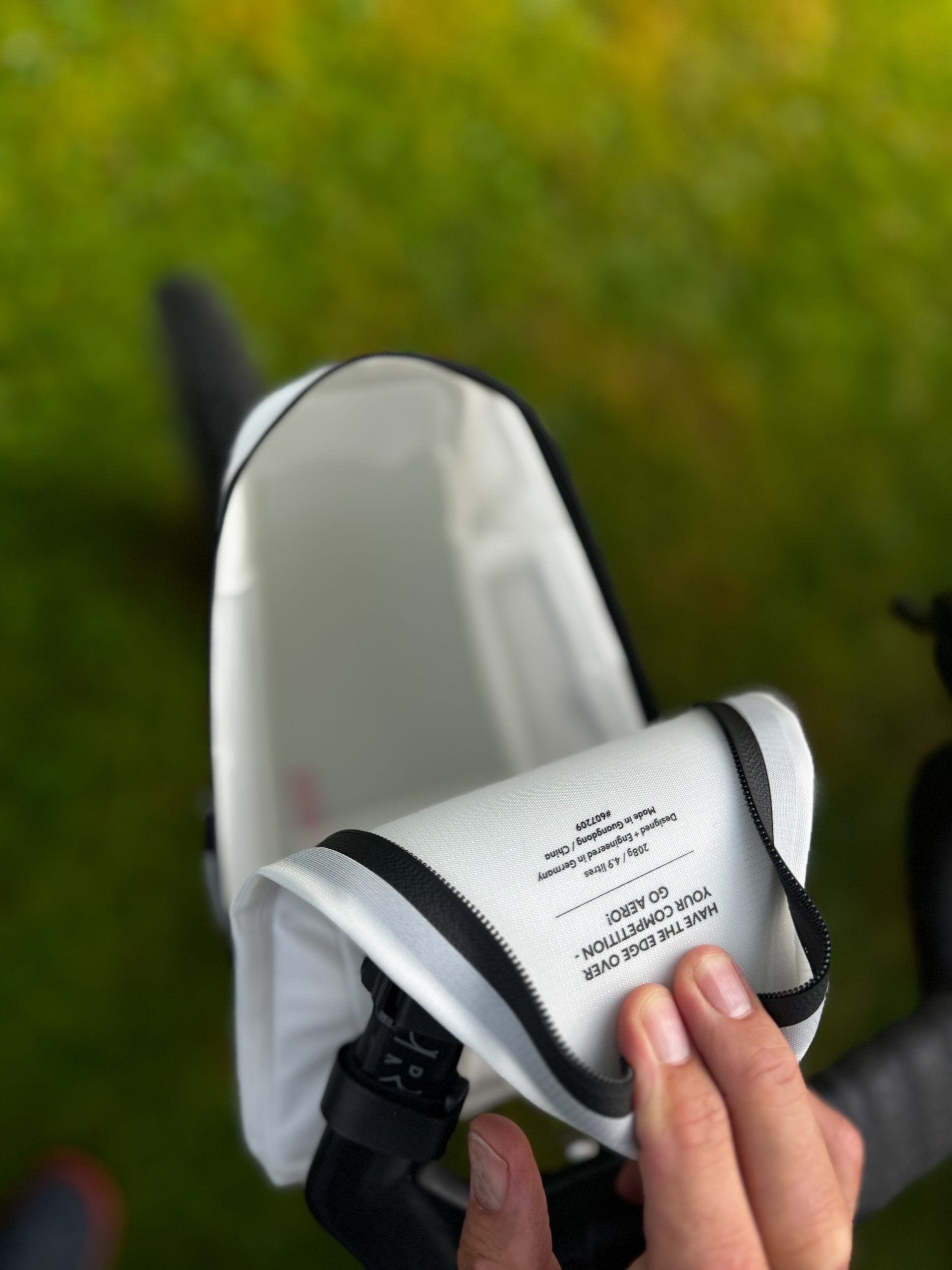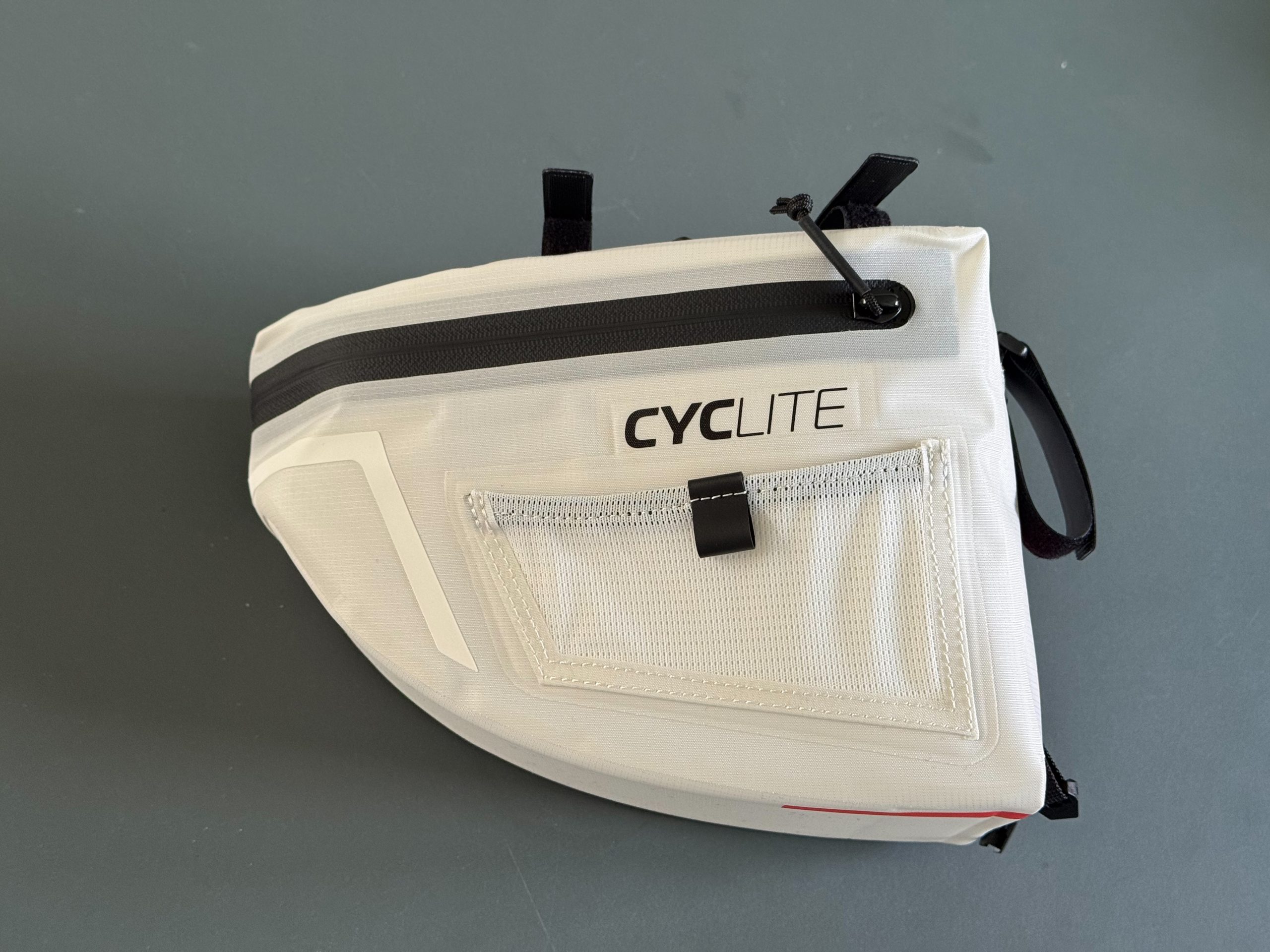 Auf den ersten Blick wirkt die Tasche kompakter als erwartet – und gleichzeitig beeindruckend leicht. Die Form erinnert an einen Schiffsbug: vorne spitz zulaufend, oben flach, insgesamt klar auf Aerodynamik ausgelegt. Besonders ins Auge sticht die weiße Farbgebung. Cyclite verfolgt damit gleich mehrere Zwecke: Sie erhöht nicht nur die Sichtbarkeit im Straßenverkehr, sondern sorgt laut Hersteller auch dafür, dass man den Inhalt schneller erkennt und weniger Zeit mit Suchen verbringt. Zudem soll sich die Tasche in der Sonne weniger stark aufheizen – ein klarer Vorteil, wenn man Schokoriegel oder andere empfindliche Snacks auf längeren Touren griffbereit haben möchte.