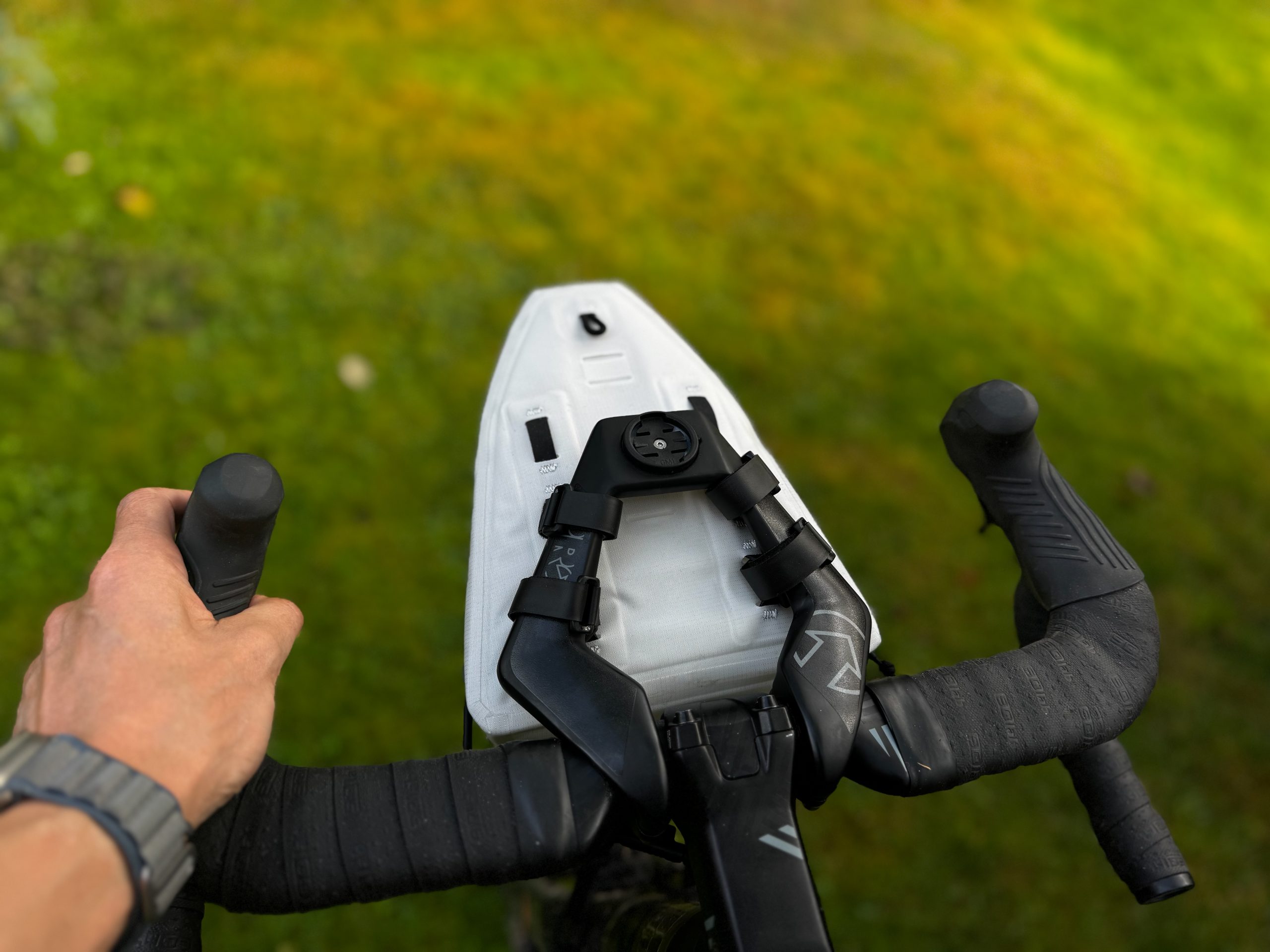 In meinem Fall habe ich die Tasche unter der Pro Compact Carbon Mini Aerobar montiert. Zwei robuste Klettverschlüsse fixieren sie sicher am oberen Deckel, während zusätzliche Gurte an der Gabel für noch mehr Stabilität sorgen. Diese Kombination verhindert zuverlässig jegliches Verrutschen oder Wackeln – selbst auf holprigen Gravelpassagen oder in ruppigem Gelände bleibt sie fest an ihrem Platz. Die Montage geht schnell von der Hand, und einmal eingestellt, muss man nichts nachjustieren.
