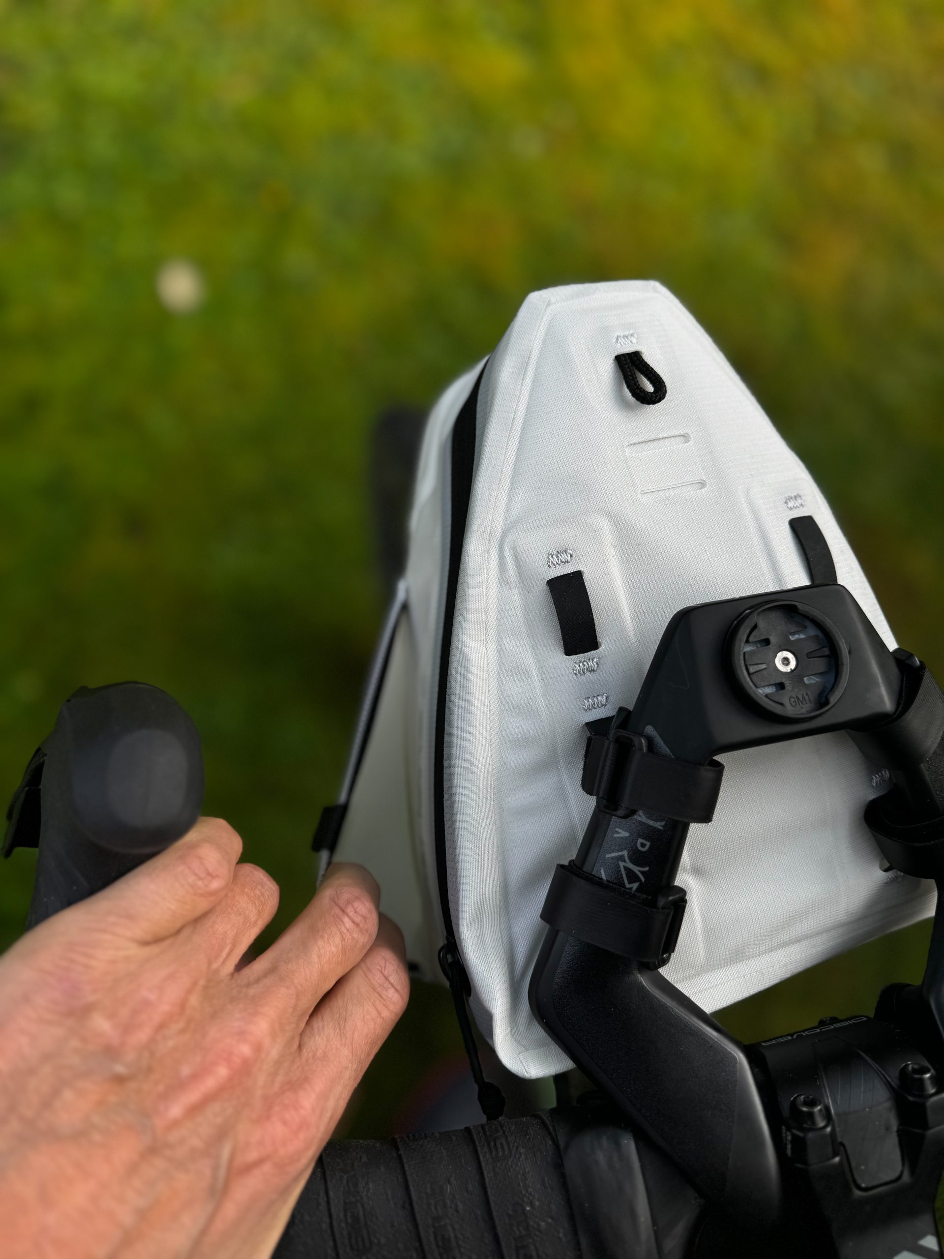 Gerade weil ich persönlich ungern viel Gewicht am Lenker trage, war ich positiv überrascht, wie ausgewogen sich die Tasche auch im beladenen Zustand fährt. Sie bietet genau den richtigen Kompromiss zwischen Stauraum, Zugänglichkeit und Fahrstabilität – und macht damit nicht nur auf langen Bikepacking-Touren, sondern auch bei Tagesausflügen eine sehr gute Figur.