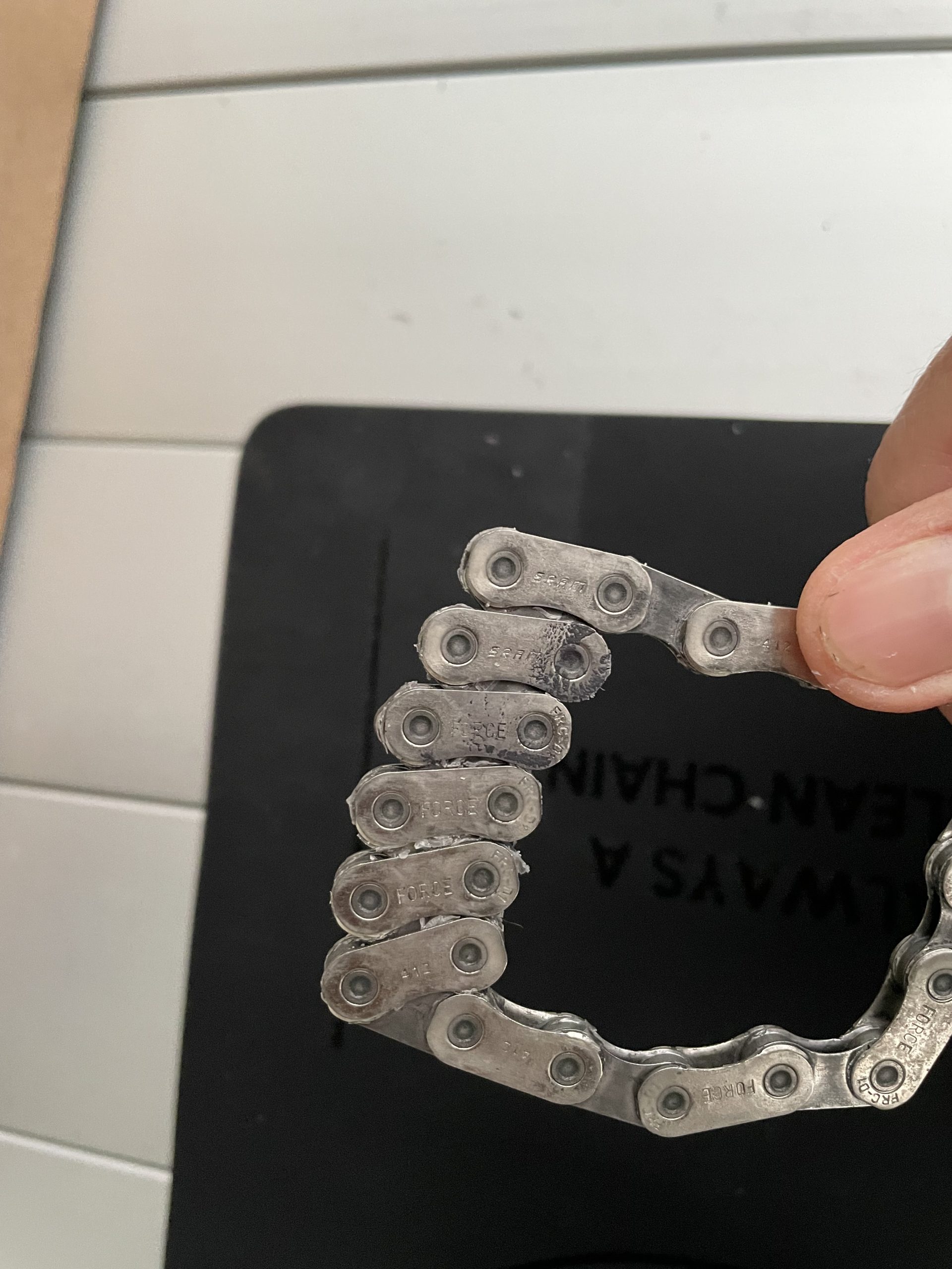 Ich bin jedoch in der glücklichen Lage, dass ich bereits gewachst fahre. Ich habe sogar eine neue ungewachste Kette besorgt. Aber als ich meine Kettenlehre in meine aktuelle Kette halte, hat sie quasi keinen Verschleiß. Ich hab sie jetzt 3.250 km drauf. Aber sie wurde stets mit Flüssigwachs behandelt und sieht nicht schön aus.