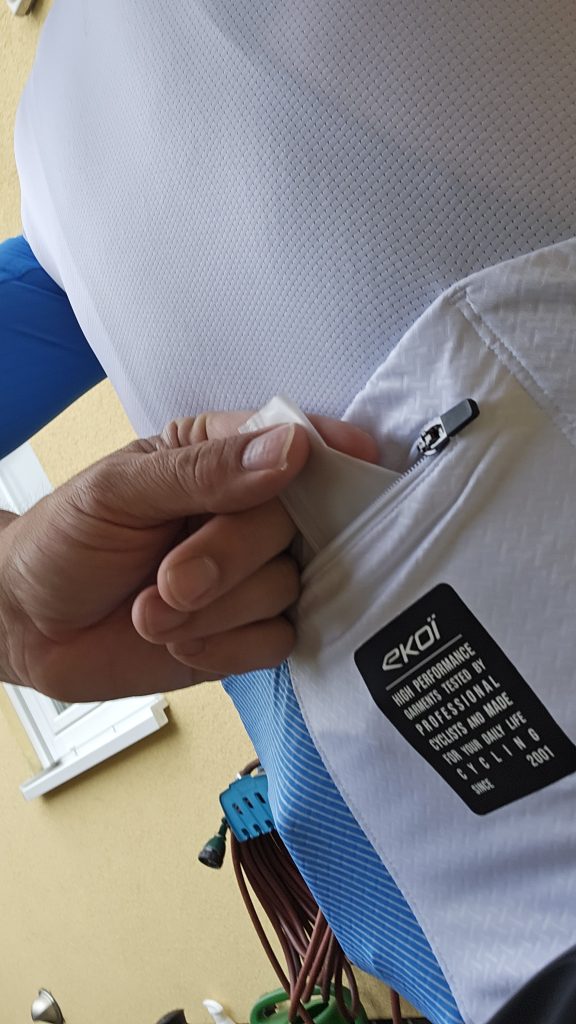 Beim Trikot ist die Auswahl riesig. Die Pref-Trikots eignen sich für 15 bis 25 Grad und sind im vorderen Bereich ein wenig Windschutz. Am Rücken ist eine Microperforation, damit Wärme abgeleitet wird. Schön ist, dass die Bündchen an den Ärmeln ohne zusätzliches Material auskommen. Auf der Rückseite sind drei Taschen, eine davon mit Reißverschluss. Die Stoffe kommen aus Spanien und Italien, gefertigt wird in Bulgarien.