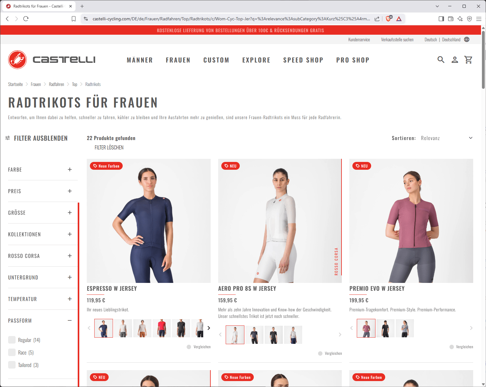 Castelli ist wie Sidi, den Ausstatter kennt jeder Radfahrer. Der Katalog reicht von einfach bis hochwertig und besteht aktuell aus 13 Kollektionen. Deshalb ist es schwierig eine allgemeine Empfehlung auszusprechen. Die Trikots gibt es in drei Passformen. Das sind Regular, Tailored und Race, die jedoch alle gut geschnitten sind. Die Regular Jerseys haben kürzere Arme. Geht man nach den Produktbeschreibungen sind alle Schnell, leicht und atmungsaktiv.