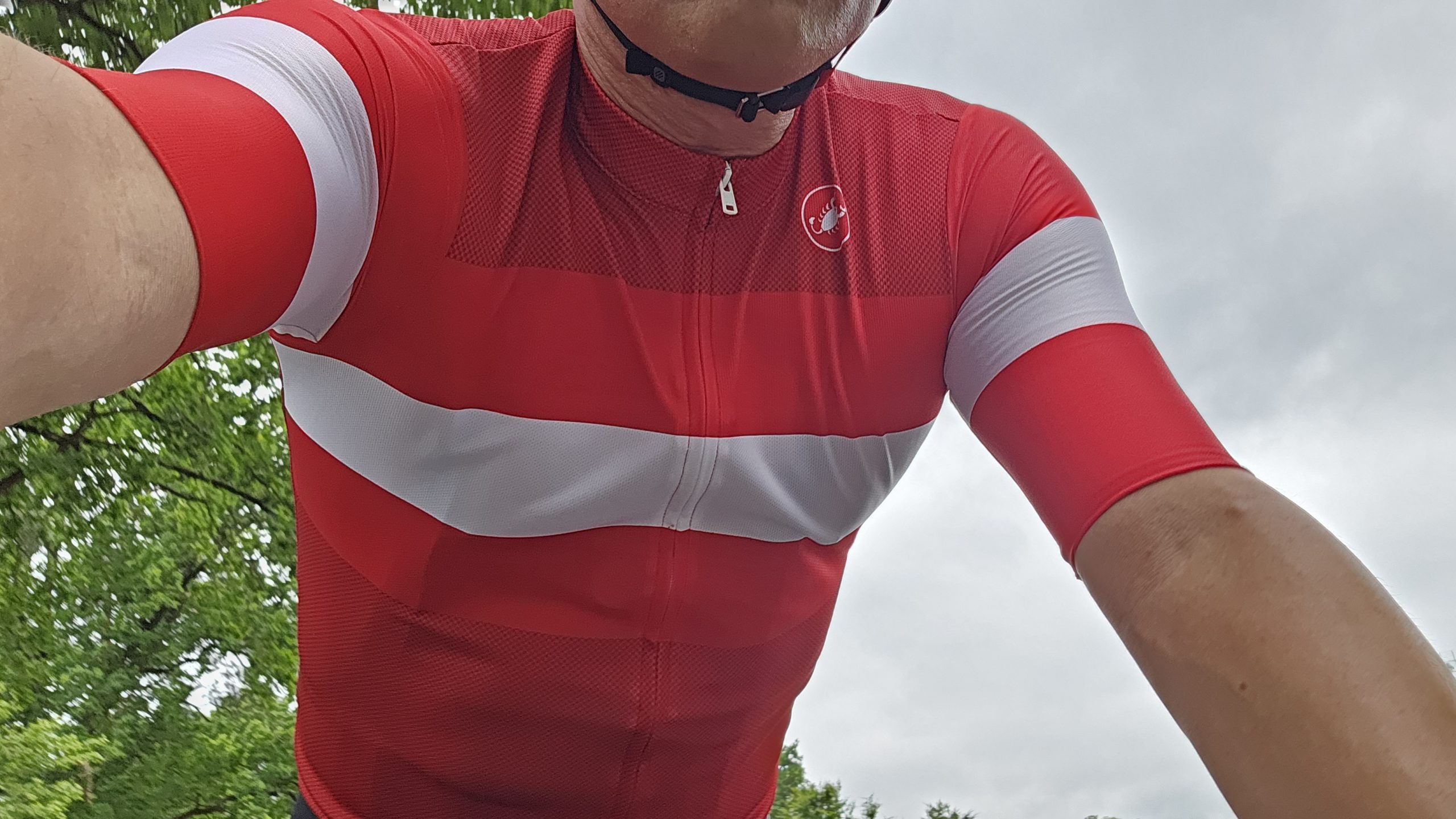 Warum fällt das draußen nicht auf? Bei ordentlichen Touren und heißen Tagen, holt man natürlich sowieso nur die guten Sachen aus dem Schrank. Workouts unter der Woche, meist bei kühleren Temperaturen, fahre ich mit der eher günstigen Castelli Velocissima. Der Wind unterstützt das Material beim trocknen und sogar die billigsten Polster bleiben auf 2-stündigen Ausfahrten noch in Form. Nur die dünnen Träger merke ich, denn die sind ein wenig unbequemer.