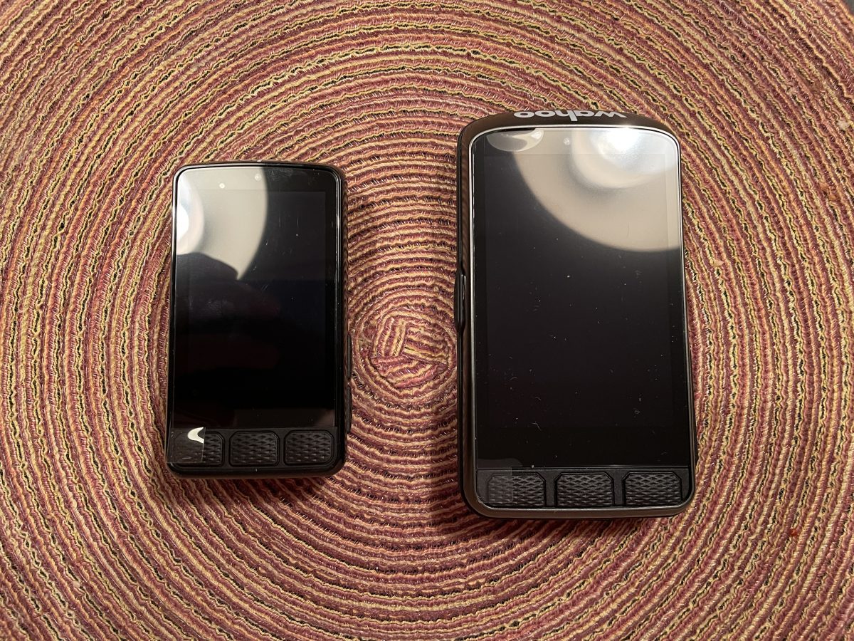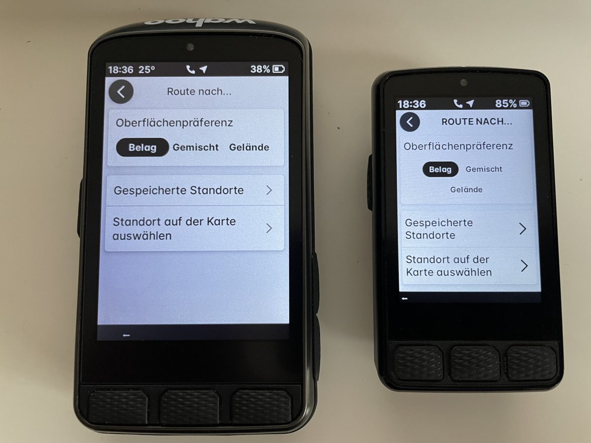Ich gehöre zu den ein bisschen älteren Menschen, ein gewisses Maß an Altersweitsichtigkeit hat sich in den letzten Jahren eingestellt. Ohne Brille könnte ich selbst den Ace nicht gut ablesen, aber mit der Größe des Ace-Displays ist alles einfacher zu sehen und das kommt mir bei meinem Altershandikap sehr entgegen. Dieser angenehme Größeneindruck verstärkt sich sogar noch, als ich auf den Roam 3 wieder zurückwechsele. Jetzt bin ich fast irritiert darüber, wie klein alles ist. Und wenn ich daran denke, wie ultraminiaturisiert alles beim Bolt 3 sein muss, wird mir ganz anders. Um ein Eindruck gewinnen zu können, hier ein paar Größenvergleichsbilder zwischen Wahoo Ace und Wahoo Raom 3: