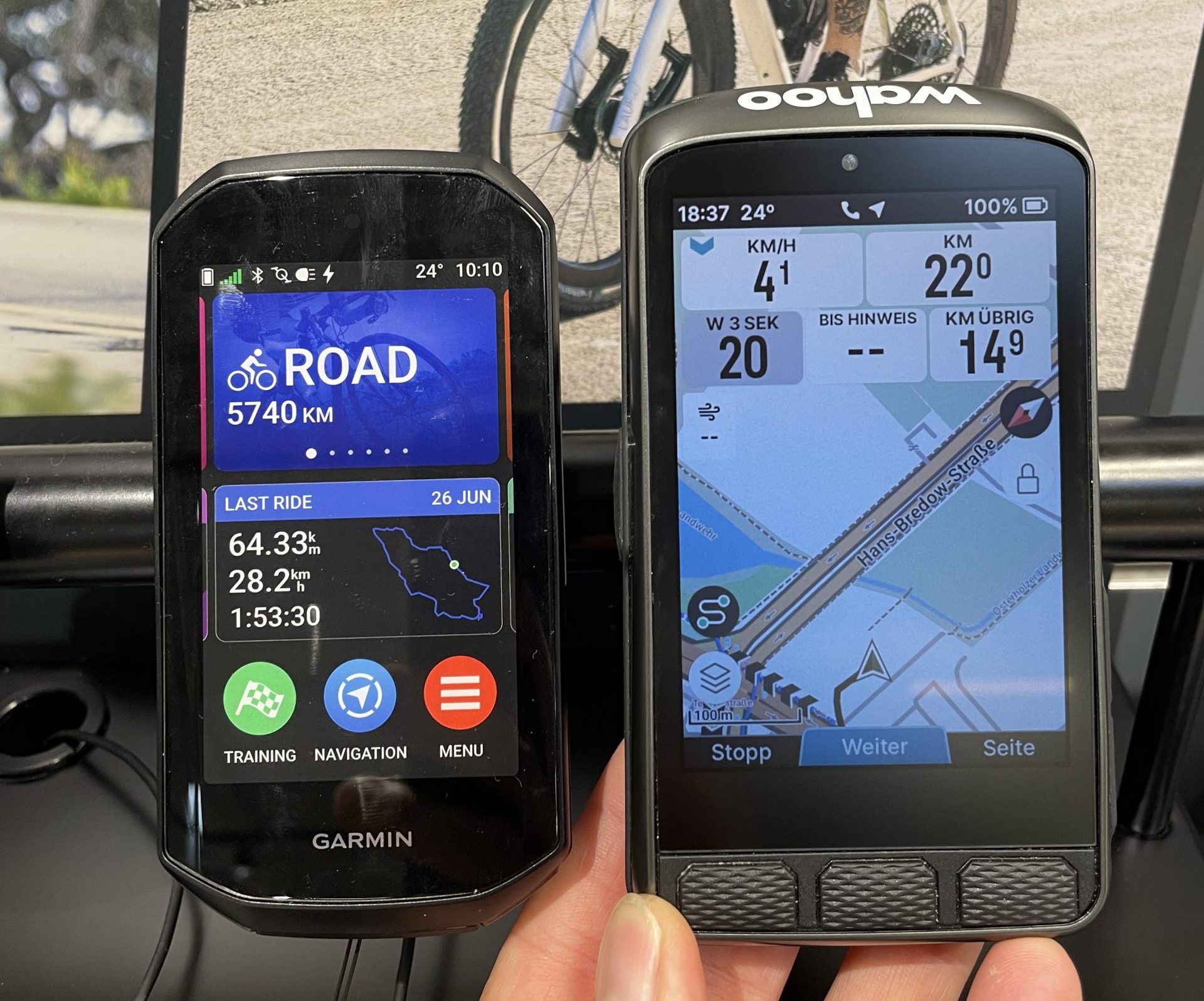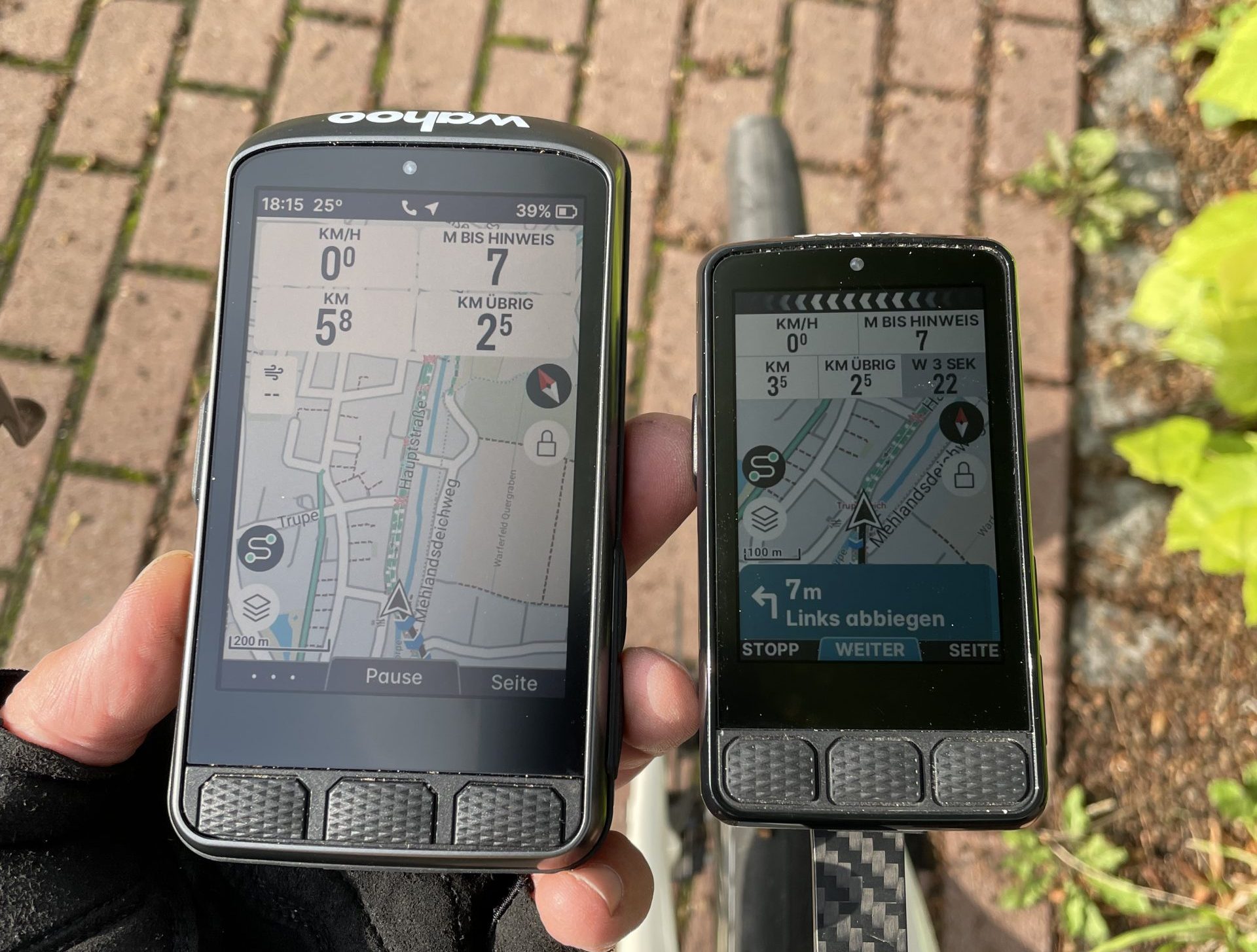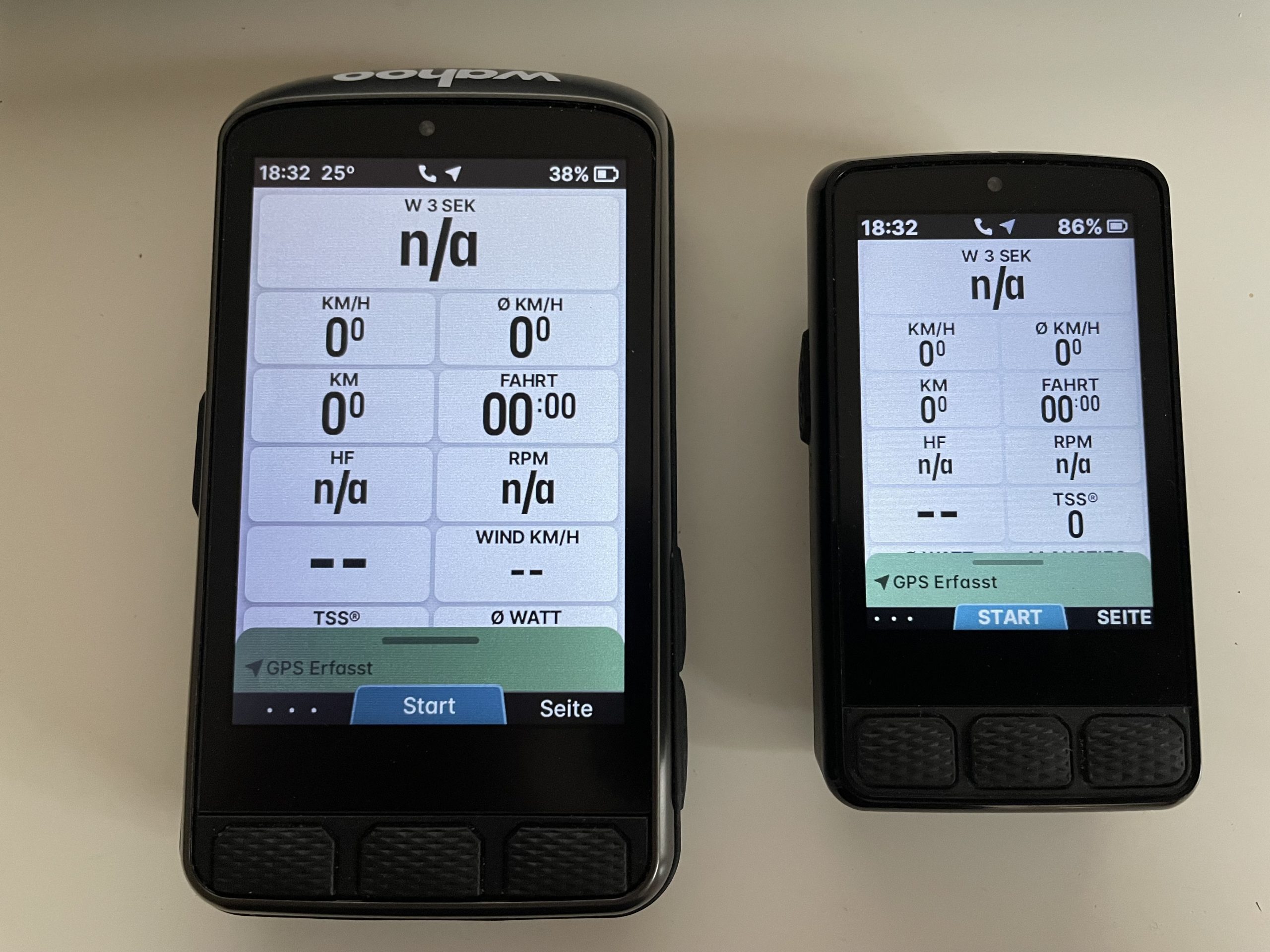 Ich gehöre zu den ein bisschen älteren Menschen, ein gewisses Maß an Altersweitsichtigkeit hat sich in den letzten Jahren eingestellt. Ohne Brille könnte ich selbst den Ace nicht gut ablesen, aber mit der Größe des Ace-Displays ist alles einfacher zu sehen und das kommt mir bei meinem Altershandikap sehr entgegen. Dieser angenehme Größeneindruck verstärkt sich sogar noch, als ich auf den Roam 3 wieder zurückwechsele. Jetzt bin ich fast irritiert darüber, wie klein alles ist. Und wenn ich daran denke, wie ultraminiaturisiert alles beim Bolt 3 sein muss, wird mir ganz anders. Um ein Eindruck gewinnen zu können, hier ein paar Größenvergleichsbilder zwischen Wahoo Ace und Wahoo Raom 3: