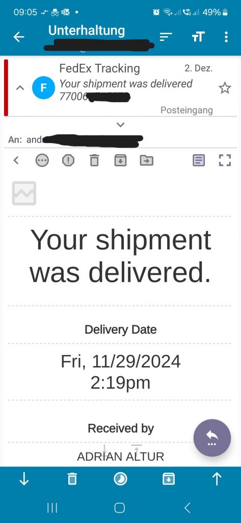Zwei Tage vor der Abholung kommt das Shipping-Label mit der Anweisung, es zwei Mal auszudrucken. Einmal soll ich es auch den Karton kleben, die Kopie unterschreiben lassen. Im üblichen Ablauf kommt der UPS-Mann bzw. die UPS-Dame, scannt den QR-Code und verschwindet mit der Sendung. Es steht dann irgendwo auf irgendeiner Website, dass das Paket übernommen wurde.