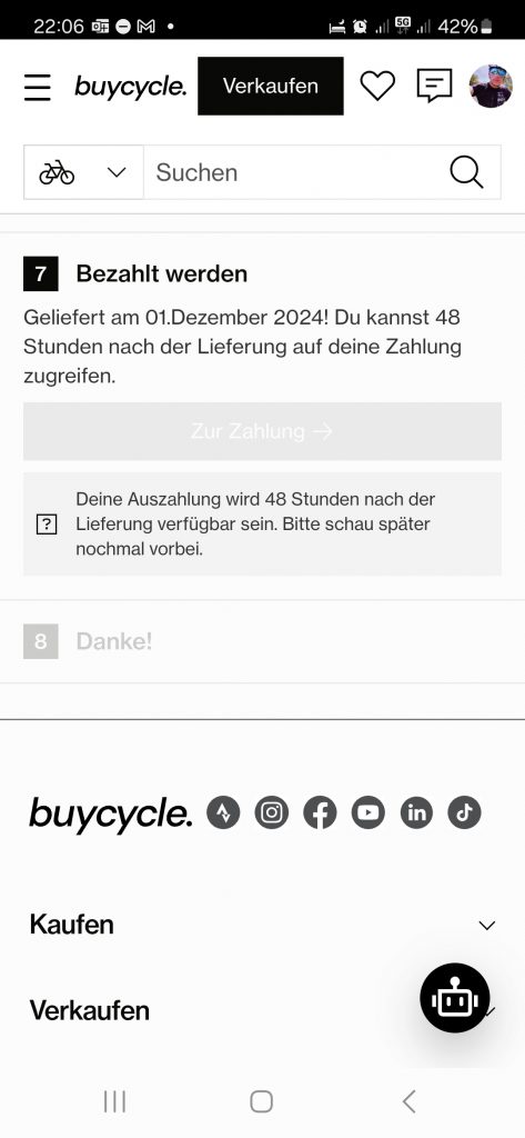 Buycycle sagt, dass der Käufer 48 Stunden Zeit hat, das empfangene Fahrrad zu prüfen. Nach dieser Frist, kann der Käufer den Kaufpreis zur Auszahlung anfordern. So hat Buycycle noch einige Tag mehr Spielgeld, denn nicht jeder Verkäufer klickt sofort auf den Button. Abgemacht ist aber abgemacht und so sind die 48 Stunden okay. Bei mir war der Button aber am 04.12. aktiv, das wären dann vier statt zwei Tage. Außerdem stimmt der bei Buycycle angegebene Geliefert-am-Tag nicht mit dem tatsächlichen Liefertag überein. 2.19 pm 29.11. in Vancover/Kanada ist in Berlin nicht 1.12., wie Buycycle es angibt.