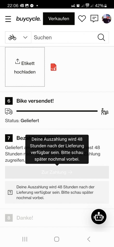 Ob der falsche Abholtag bei Buycycle oder UPS verursacht wurde, kann ich nicht nachvollziehen. Auch das mit Transportgütern nicht gut umgegangen wird, ist nicht direkt die Schuld von Buycycle. Wenn der Karton während eines Verkaufsprozesses stillschweigend auf einmal 20 Euro kosten soll, ist nicht vertrauensvoll. Zum Schluss noch die nicht bezahlte Rechnung von UPS und die Verzögerung der Auszahlung.