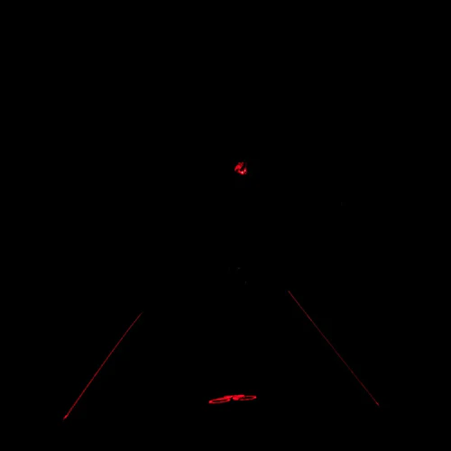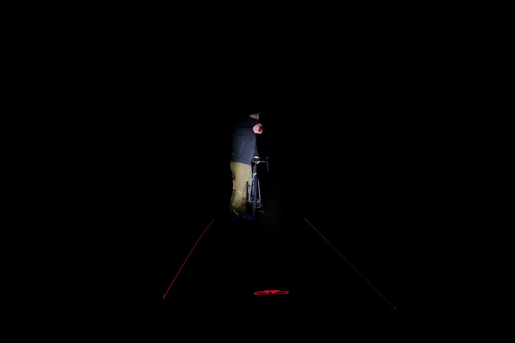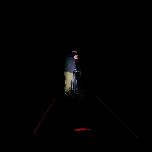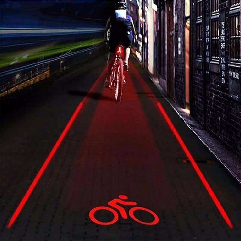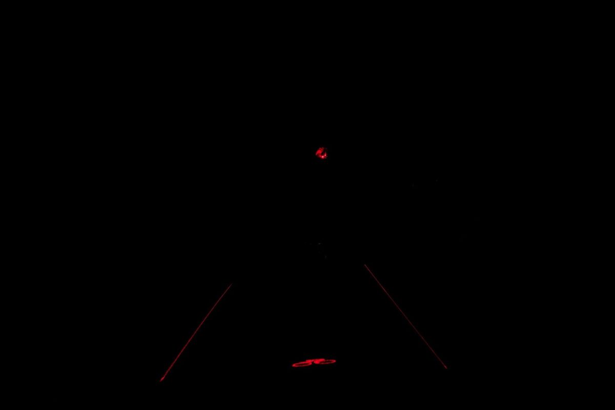 Ein Laser Projektionsrücklicht haben wir uns besorgt, obwohl es nicht als StVO gekennzeichnet ist. Das war bei Ebay für 2 bis 20 Euro, je nach Verkäufer. Die Abbildungen sind alle gleich oder zumindest sehr ähnlich (links). Bei wirklich vollständiger Dunkelheit war die Projektion nicht mit der Abbildung vergleichbar. Nur wenn die Lampe mindestens 1,50 Meter über dem Boden am Rad angebraucht wäre, ist der Effekt zumindest annähernd wie auf dem Fotos. Die Lampe ist komplett unbrauchbar.