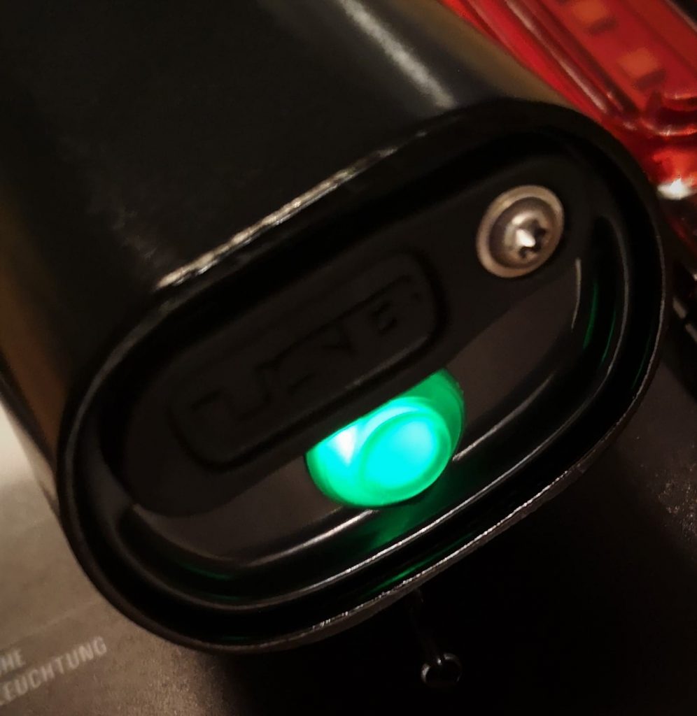 Der Schalter auf der Rückseite ist mit einem Gummi geschützt. 3 Sekunden drücken und die Lampe scheint. Wie voll der Akku ist, wird mit einem farbigen Lämpchen im Schalter dargestellt. Die drei Stufen lassen sich mit kurzem Drücken durchschalten. Beim Rücklicht ist der Schalter oben. Gut hierbei, dass man den Druckpunkt spürt. Bei der Busch und Müller Ixis ist das An/Ausmachen mit Handschuhen nicht fühlbar. Das Rücklicht der Lezyne Pro 115 ist auch von der Seite erkennbar. Geladen wir in 5 bis 6 Stunden bzw. das Rücklicht in 3 Stunden per beiliegendem USB Kabel. Die Ladebuchse ist mit einem dicken Gummideckel verschlossen, der an die Lampe geschraubt ist.
