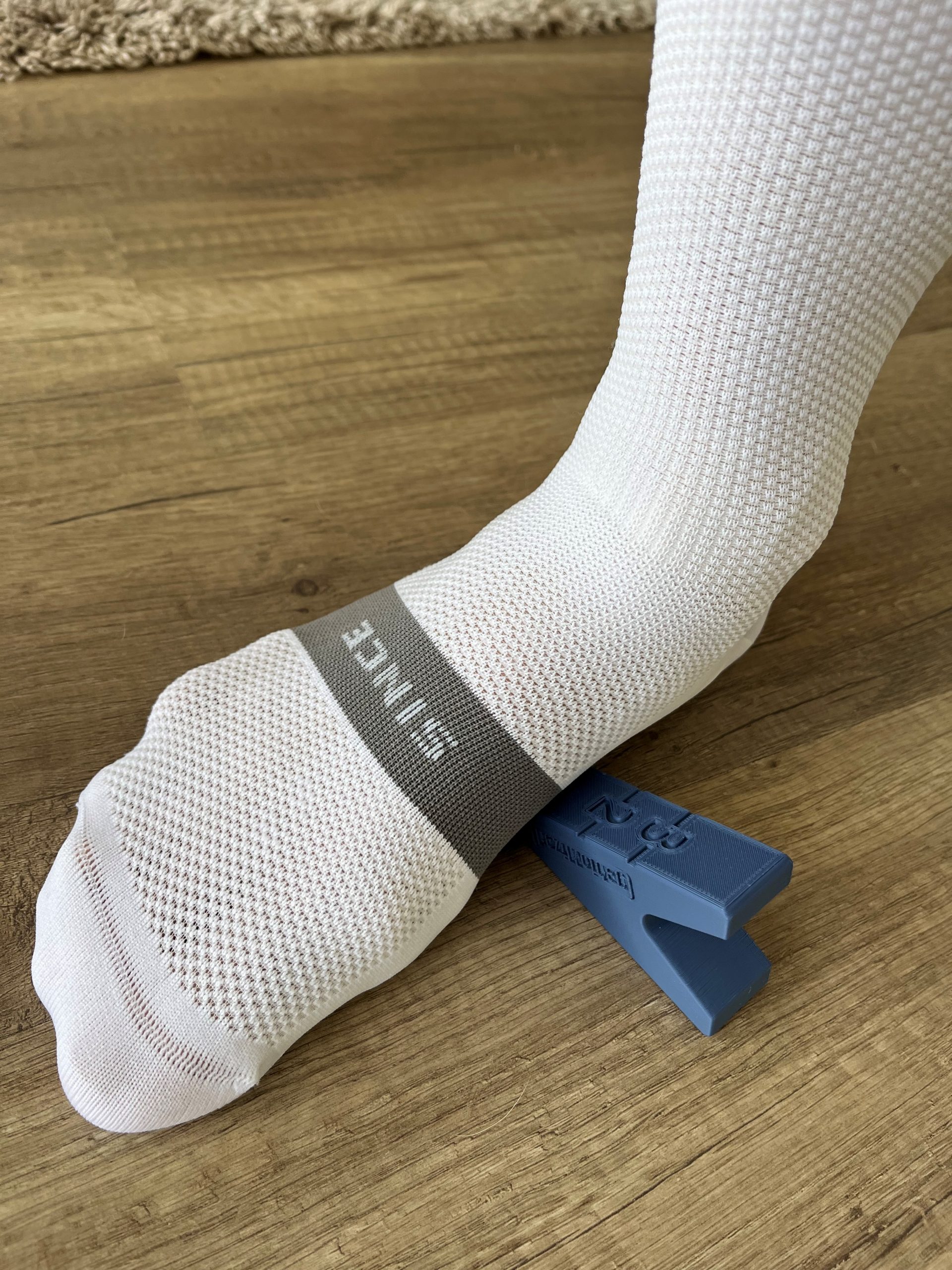Die GebioMized Einlagen Push Semi-Custom gibt für drei verschiedene Fußgewölbehöhen. Mit einem Keil unterm Fuß wird gemessen und dann die Sohle in Low, Medium oder High ausgewählt. Damit der Radfahrer nicht mit einem Kompromiss leben muss, können die Einlagen für den linken und den rechten Fuß in unterschiedliche Größen und auch Stärken bestellt werden.