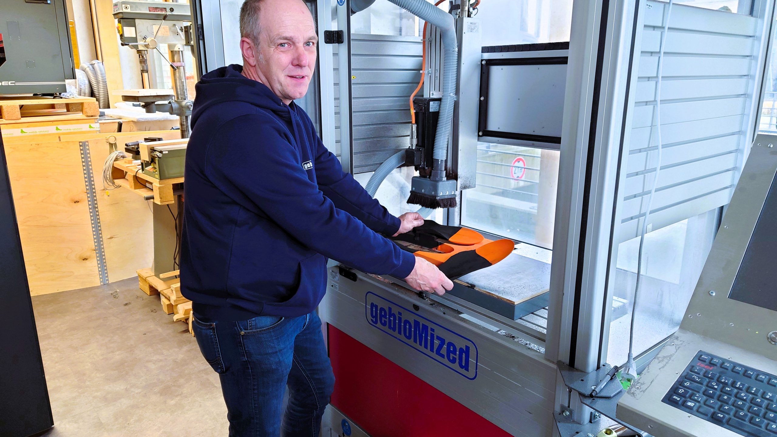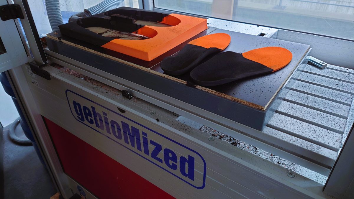 Das jedes Einlagensystem individuell auf die einzigartige Anatomie des Sportlers „konstruiert“ ist, erklärt sich so von selbst. Jede Fußseite ist damit optimal angepasst. Nach der Messen und Analyse werden die Einlagen in einer CNC-Maschine gefräst. Zuerst die Unterseite, die damit perfekt zum Fahrrad und Pedal passt. Dafür ist eine Datenbank vorhanden. Anschließend kommt die Oberseite, für die Auflagefläche des Fußes.